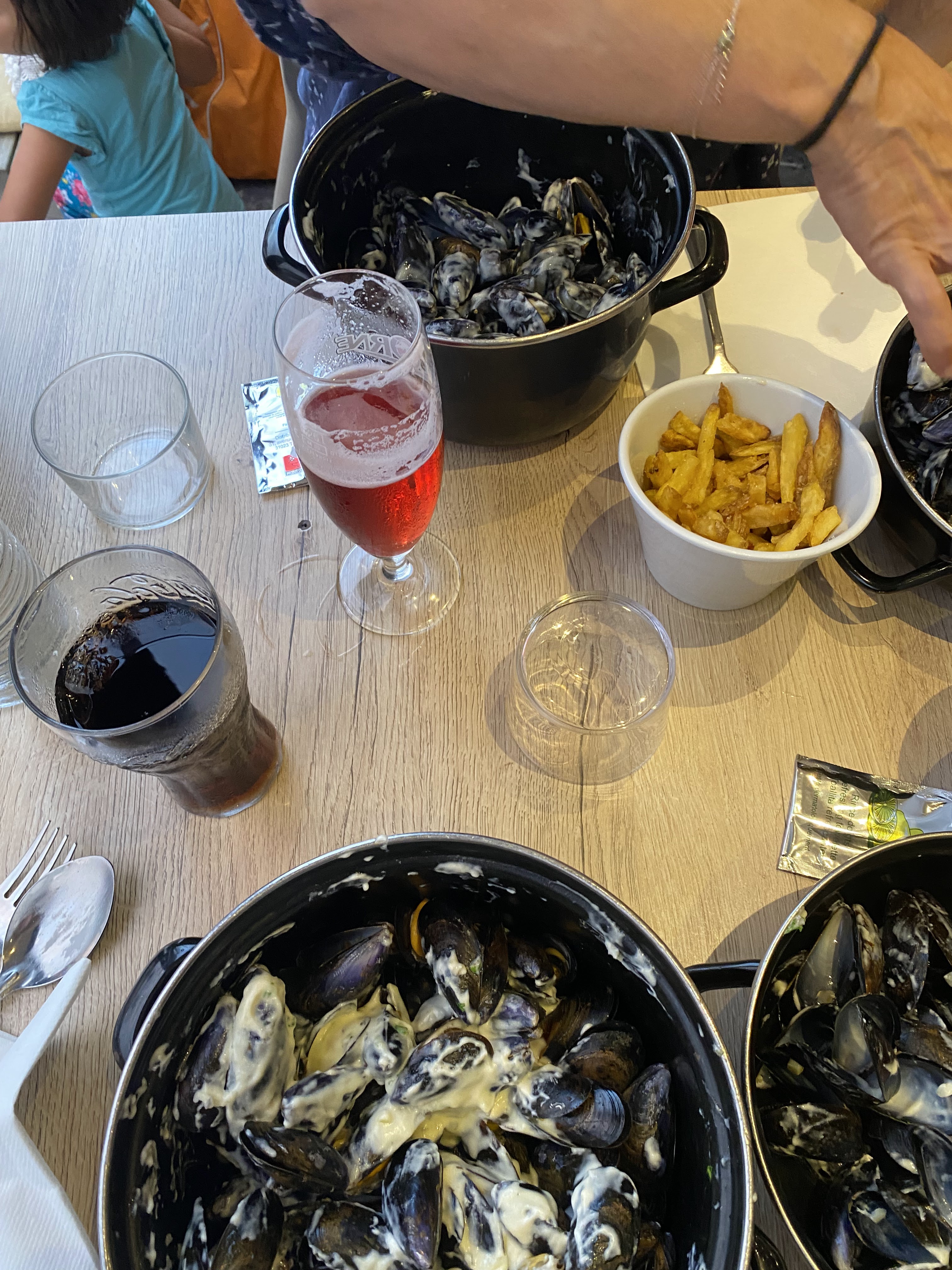 A FUIR !!!!! Nous avons été manger des moules avec une amie.. Une catastrophe. Des moules à la crème EXTREMEMENT salés , la crème avait le goût d'un cube or.. Quand je demande des informations sur la recette à la serveuse la réponse de celle ci est Il y a du vin blanc et de la crème , en gros. , le pain demandé à deux reprise arrive sur la table à la fin du repas. Nous demandons des rince doigt à la serveuse car non fournis elle nous dit qu'elle nous les ramène avec les cuillère non donner encore une fois tout ça après avoir fini les moules.. Sans compter le comportement insupportable du patron envers ses employés et les commentaires déplacé aux clients en passant par des cartes jetées aux clients. Serveuse tout de même agréable. Pour finir nous avons manger des moules à la crème très bizarre et nous avons eu mal au ventre toute la nuit et le service étais déplorable. Passer votre chemin.