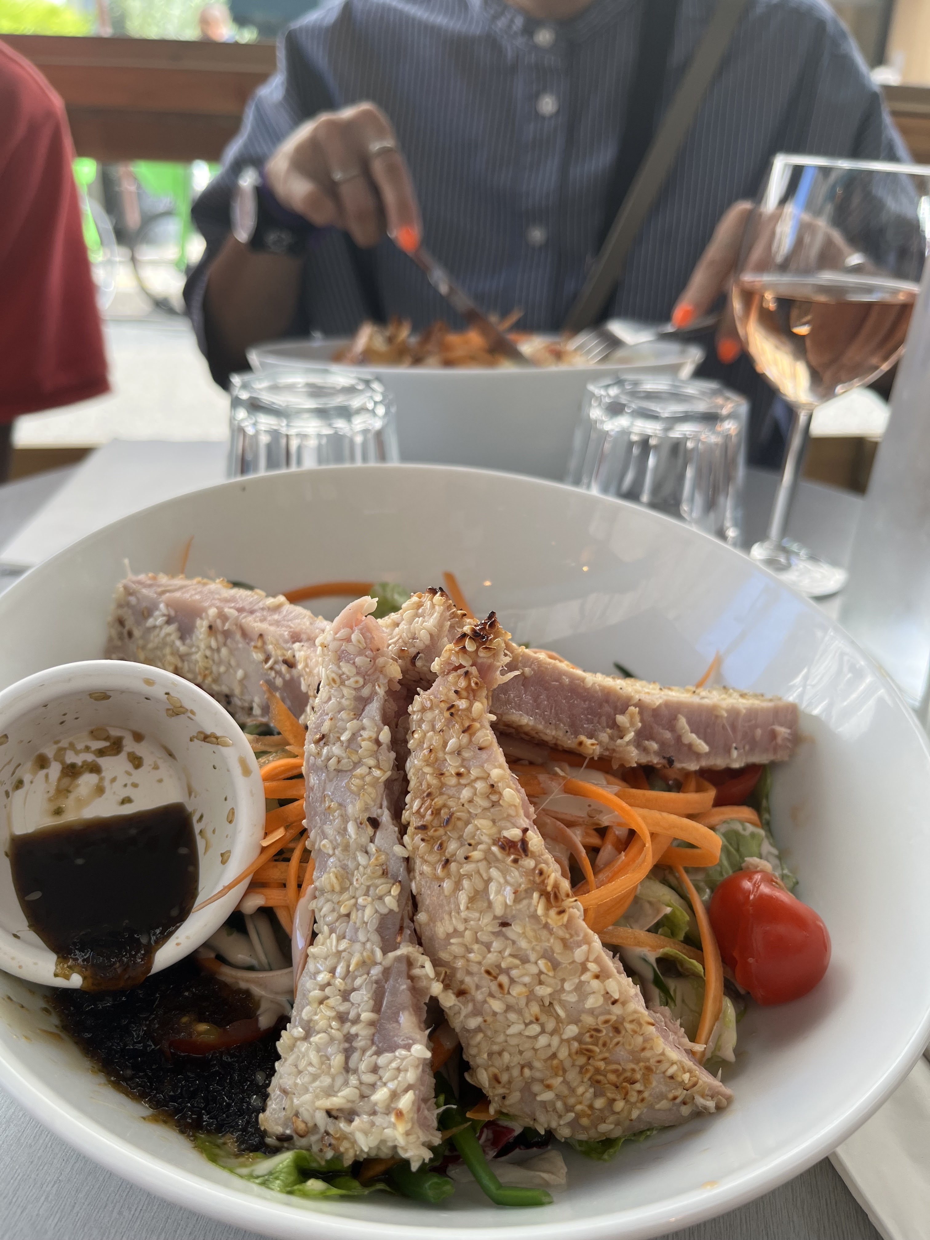 Je suis venu ici pour déjeuner avec un ami qui était à Paris pour faire du tourisme. Il est situé juste à côté de l'Arc de Triomphe et des Champs Elysées, donc il semblait y avoir beaucoup de clients locaux. J'ai eu la salade de thon originale qui porte le nom du restaurant et mon ami a pris la salade de fromage grillé et le poulet grillé. Bien que la vinaigrette ait une saveur asiatique, elle contient également des éléments français, avec une acidité et une saveur douces. Le thon n'était pas du thon en conserve, mais du thon grillé mi-saignant, saupoudré de nombreuses graines de sésame, et était parfumé et délicieux. Je suis entré dans ce magasin sans aucune attente, mais cela s'est avéré être un grand succès. C'était vraiment délicieux. La nourriture de mon ami et le sorbet après le repas étaient délicieux et j'étais satisfait.