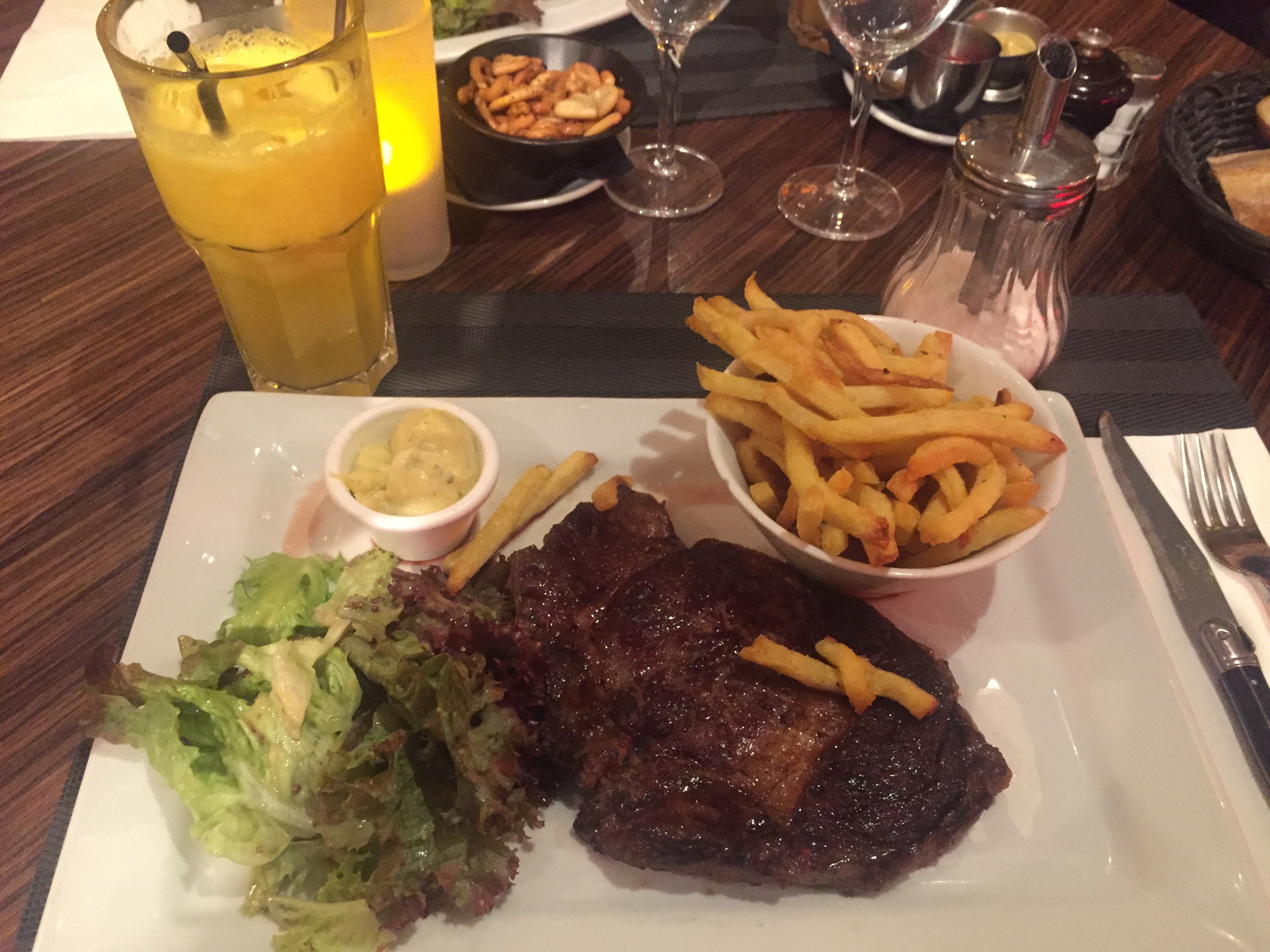 Cocktails copieux, forts et bon prix. Nous avons eu une côtelette de bœuf étonnamment savoureuse et le steak et les frites étaient délicieux