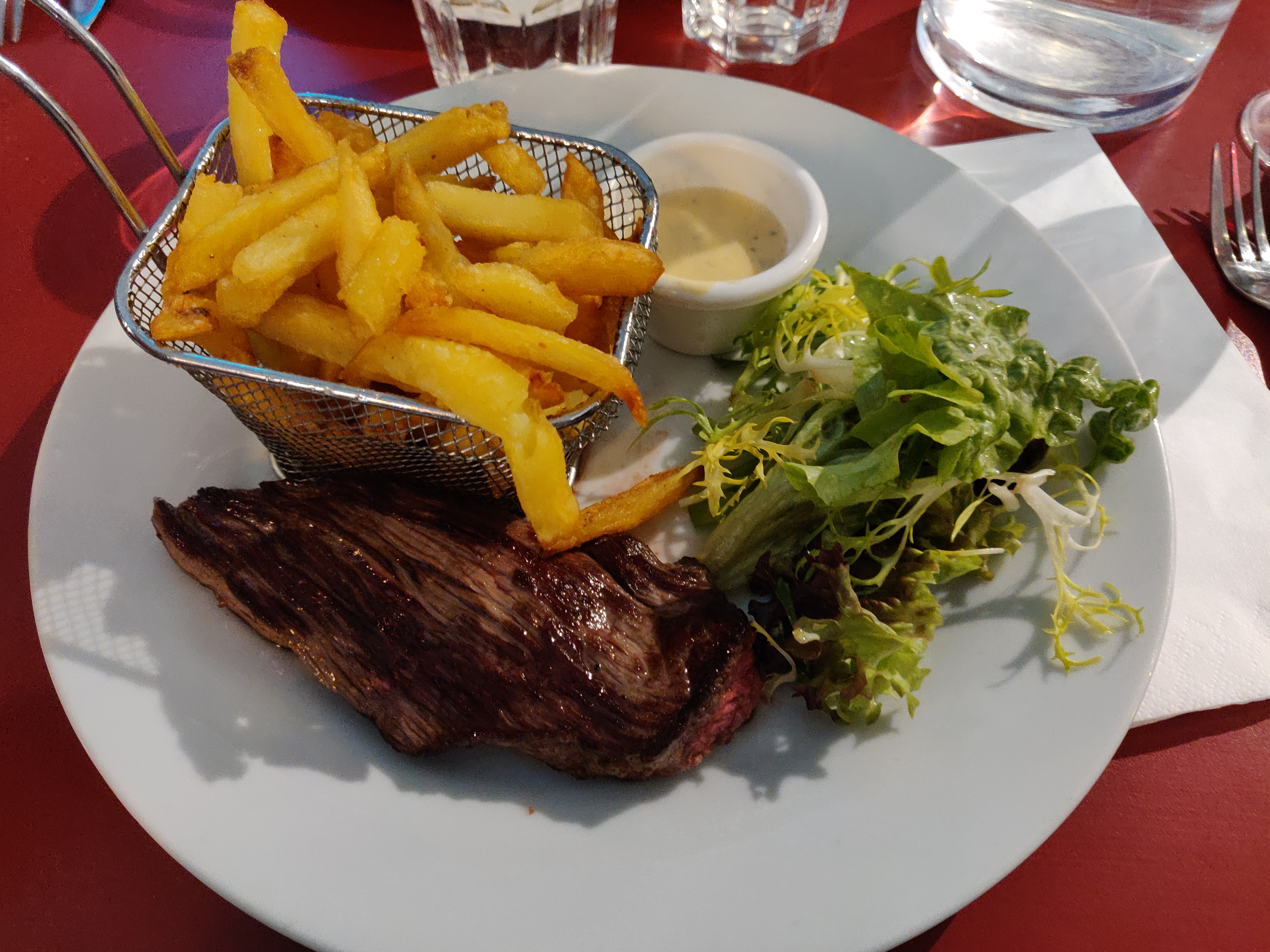 La bavette est caoutchouteuse donc je déconseille sinon le café gourmand est très généreux je conseil vivement. Quand au personnels un serveur très gentil et efficace malgré sa tenue vestimentaire un peu trop décontractée à mon goût.