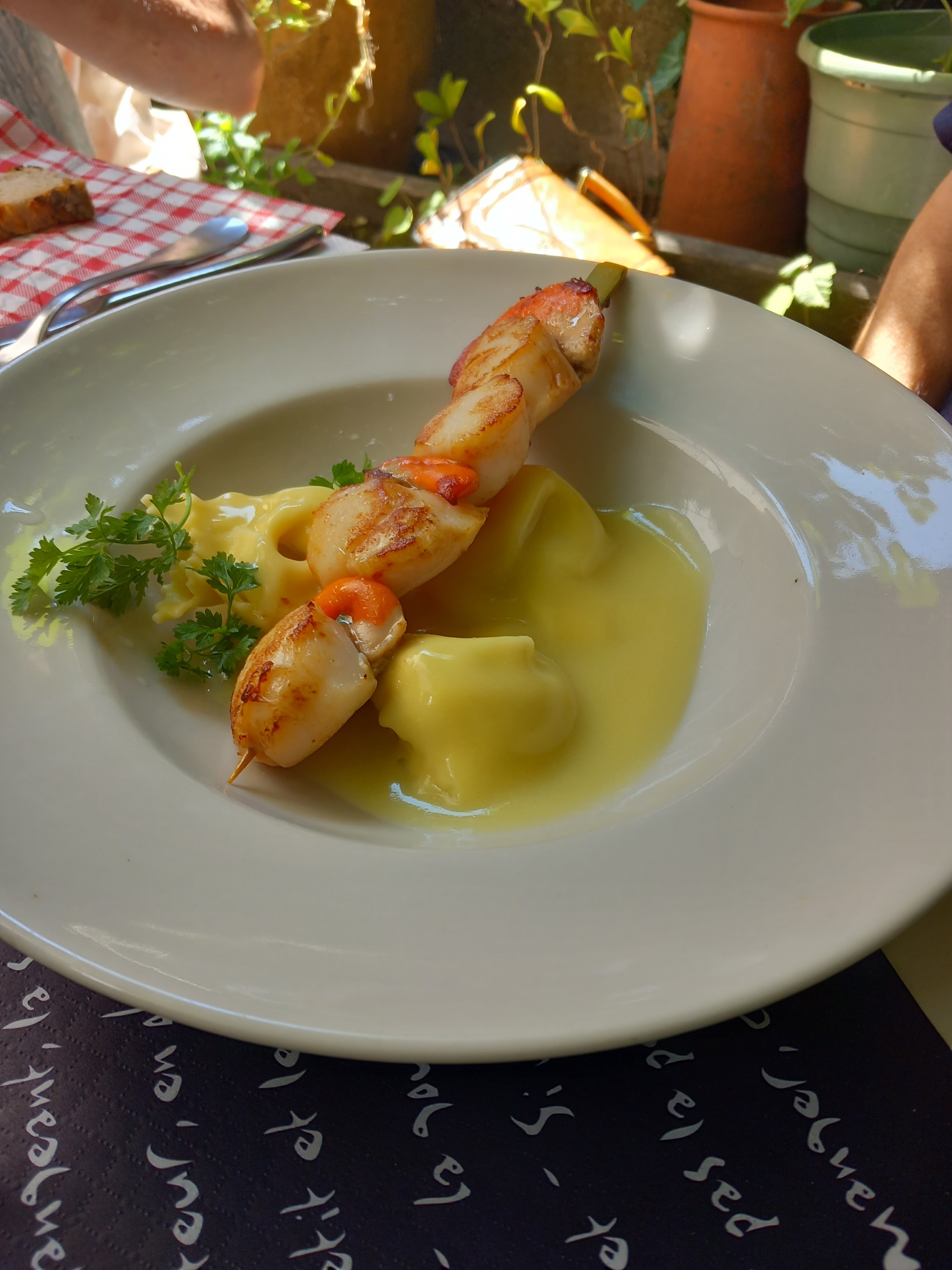 Attirés par une formule alléchante qui ne comportait pas 250 plats différents nous y avons fait un excellent repas , saumon fumé et brochette de coquilles St Jacques un régal ! Et servis par une personne aimable ,agréable et souriante , bref un bon moment dans un cadre sympa. Si nous repassons par Barbizon on y retourne sans hésiter