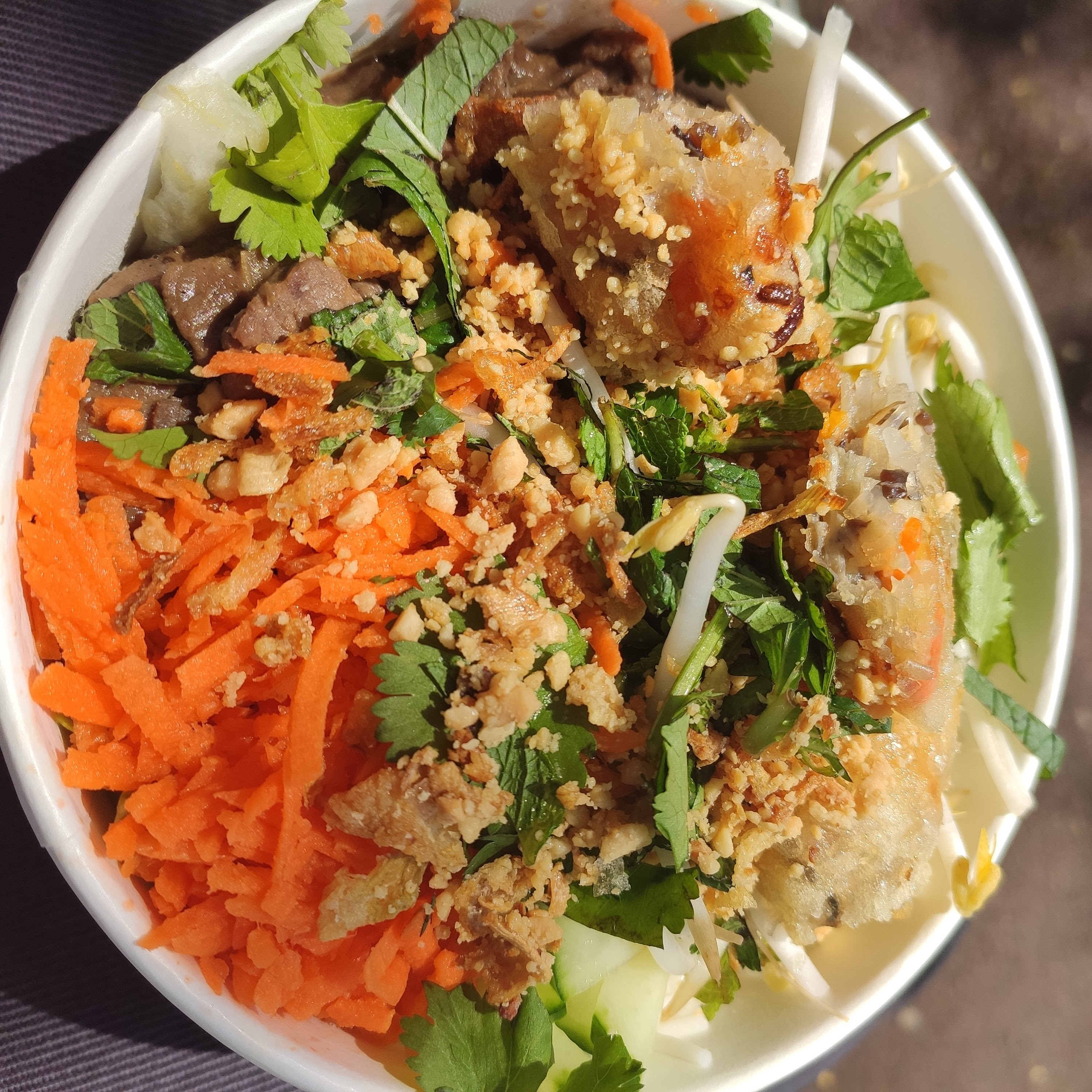 Petite boutique à emporter uniquement, elle ne paye pas de mine, mais ça serait malheureux de passer devant sans s'y arrêter ! Le service y est très sympathique et on vous accueille agréablement, il n'y avait plus de carottes alors on m'a proposé un nem (au porc ou vegan) à la place, à vrai dire je pense être gagnant au change ! On m'avait dit que c'était assez copieux, pourtant la petite boîte qu'on m'a donné lorsque j'ai demandé un bo bun au boeuf paraissait normale... quelle erreur ! Quand ils disent que c'est copieux, c'est absolument vrai ! Le bo bun était un peu à l'étroit lorsque j'ai ouvert la boîte, alors j'ai préféré transférer tout ça dans un bol, et il y en avait pour deux personnes ! Vietnamien d'origine, je suis habitué au goût des bo buns traditionnels, et bien celui-ci est très réussi ! La viande est tendre et la coriandre est parfumée, les concombres généreusement coupés ! La petite boîte est bien pratique pour prendre à emporter mais elle ne fait pas honneur au plat ! Dans tous les cas ne vous arrêtez pas aux apparences, ni de la boutique ni du bo bun, votre estomac vous remerciera ! Très léger bémol par contre, le bo bun était un peu plus liquide que prévu, peut-être la salade ou les vermicelles qui avaient encore un peu trop d'eau. Ça ne m'a pas gêné car je ne mets pas beaucoup de nuoc mam mais c'est selon les goûts !