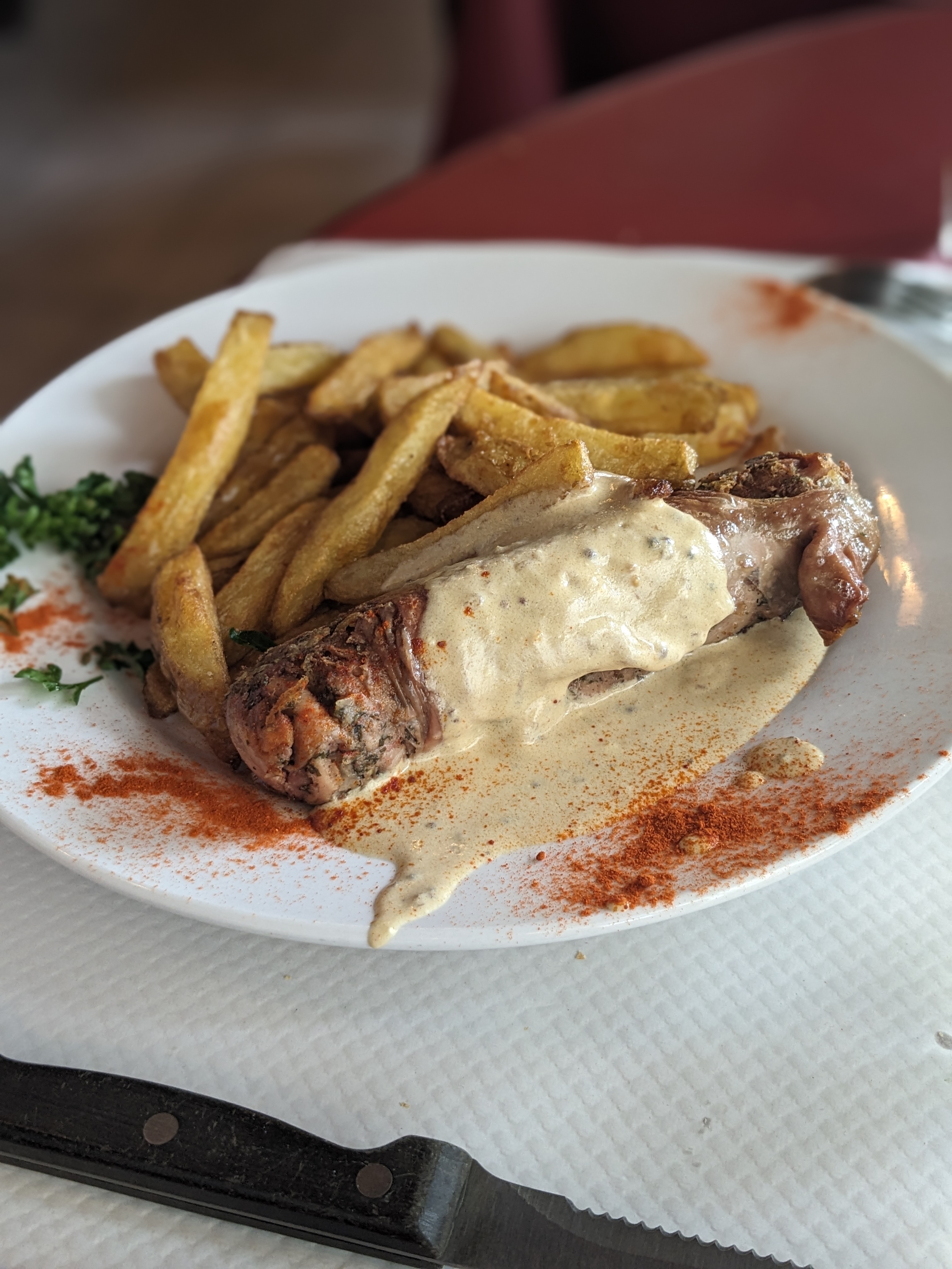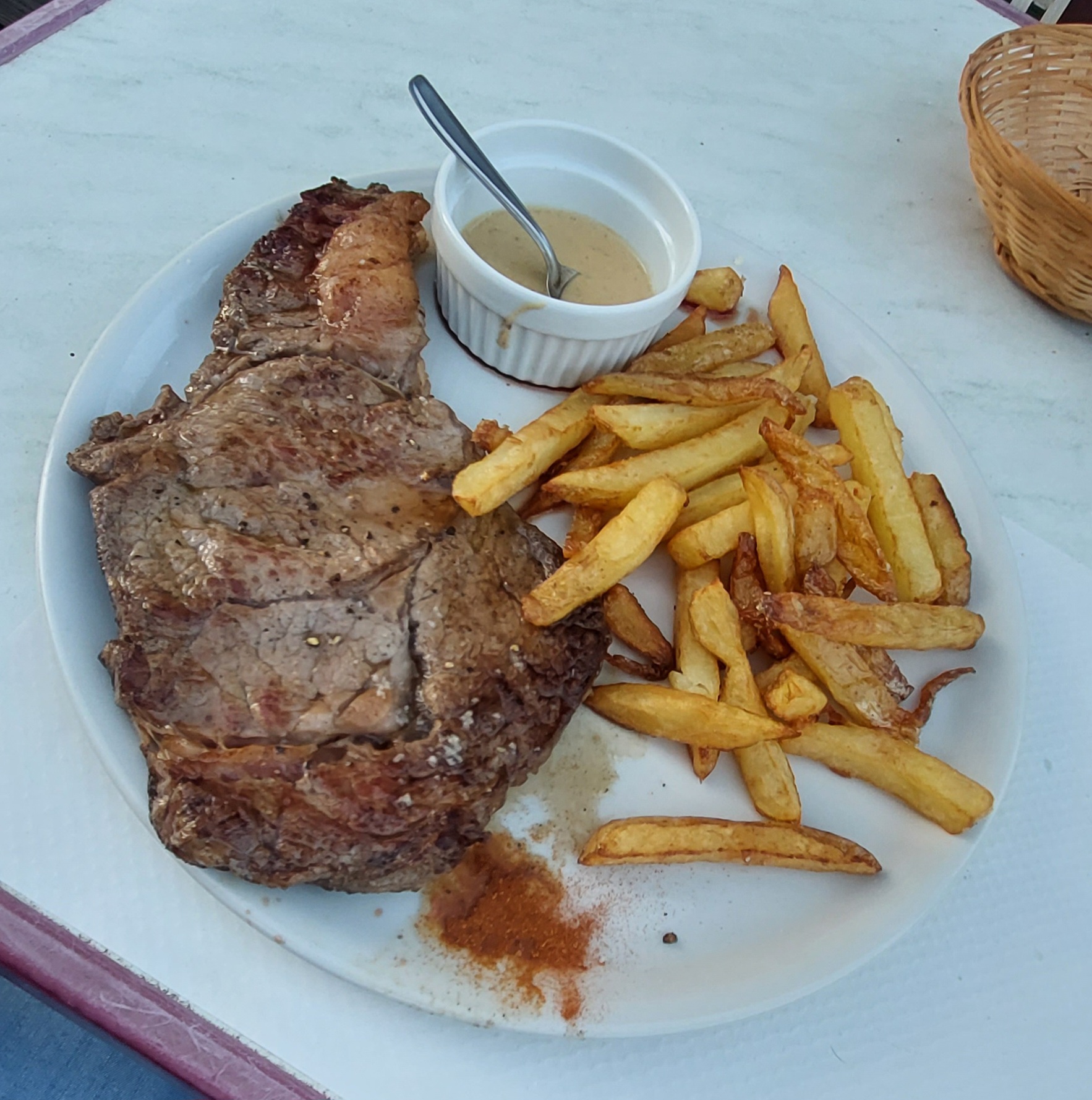 Très belle entrecôte de 420 grammes, fraîchement sortie d'une vache à 7km. Servi avec des frites incroyables. Propriétaire sympathique qui parle également anglais.