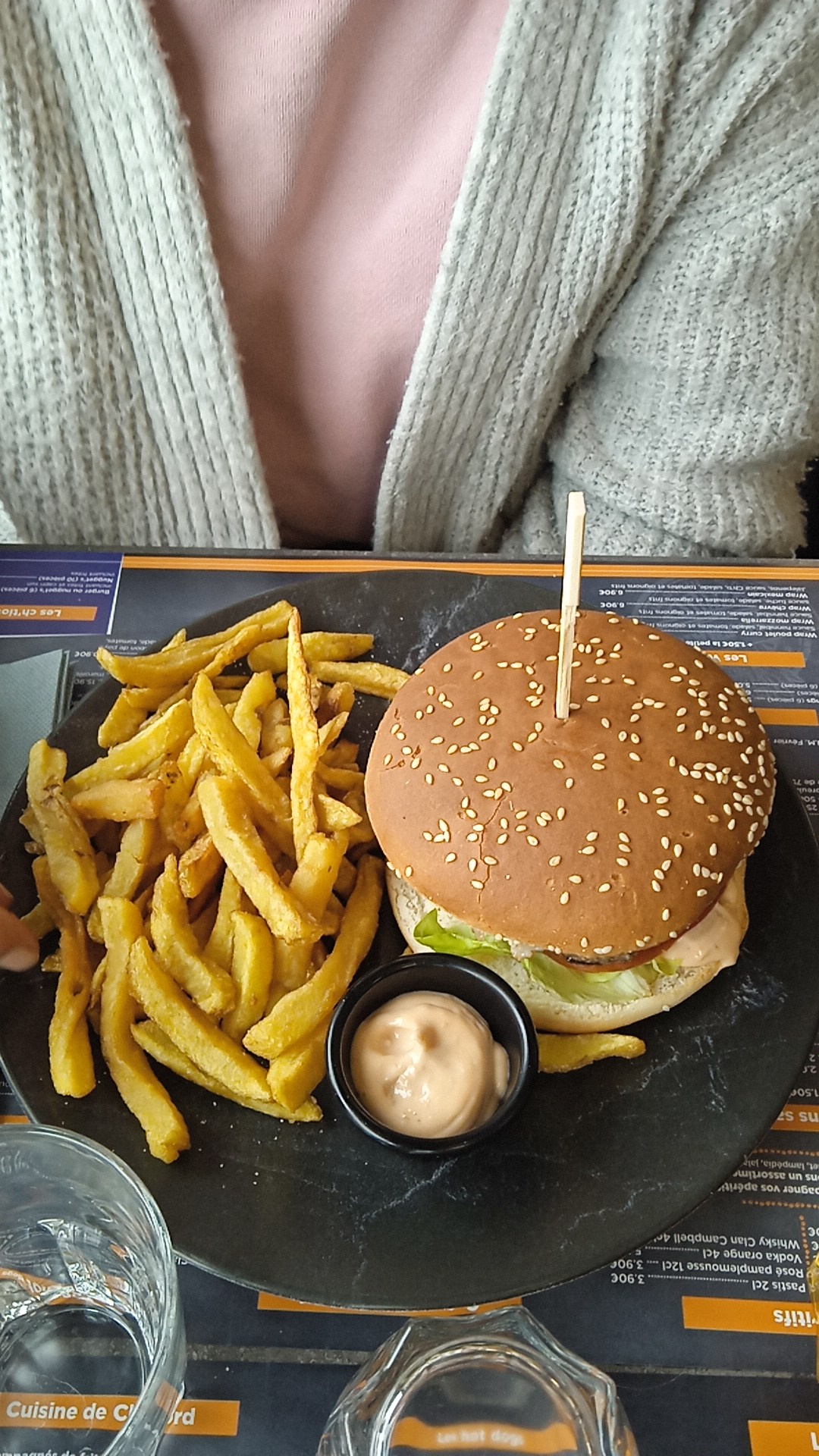 Autant aller chez MacDo, c'est la même came en moins cher ! Le pain du burger était un peu dur, ça sent bien le décongelé. Les frites auraient pu être bonnes malheureusement elles sont cuites et re-cuites dans l'huile donc pas ouf. 11€40 pour manger moins bien que dans un fast food (la grande barquette de frites est vendue 3€ et est minuscule, j'imagine pas leur moyenne frite) Très dommage car les patrons ont l'air gentils et le lieu est chaleureux