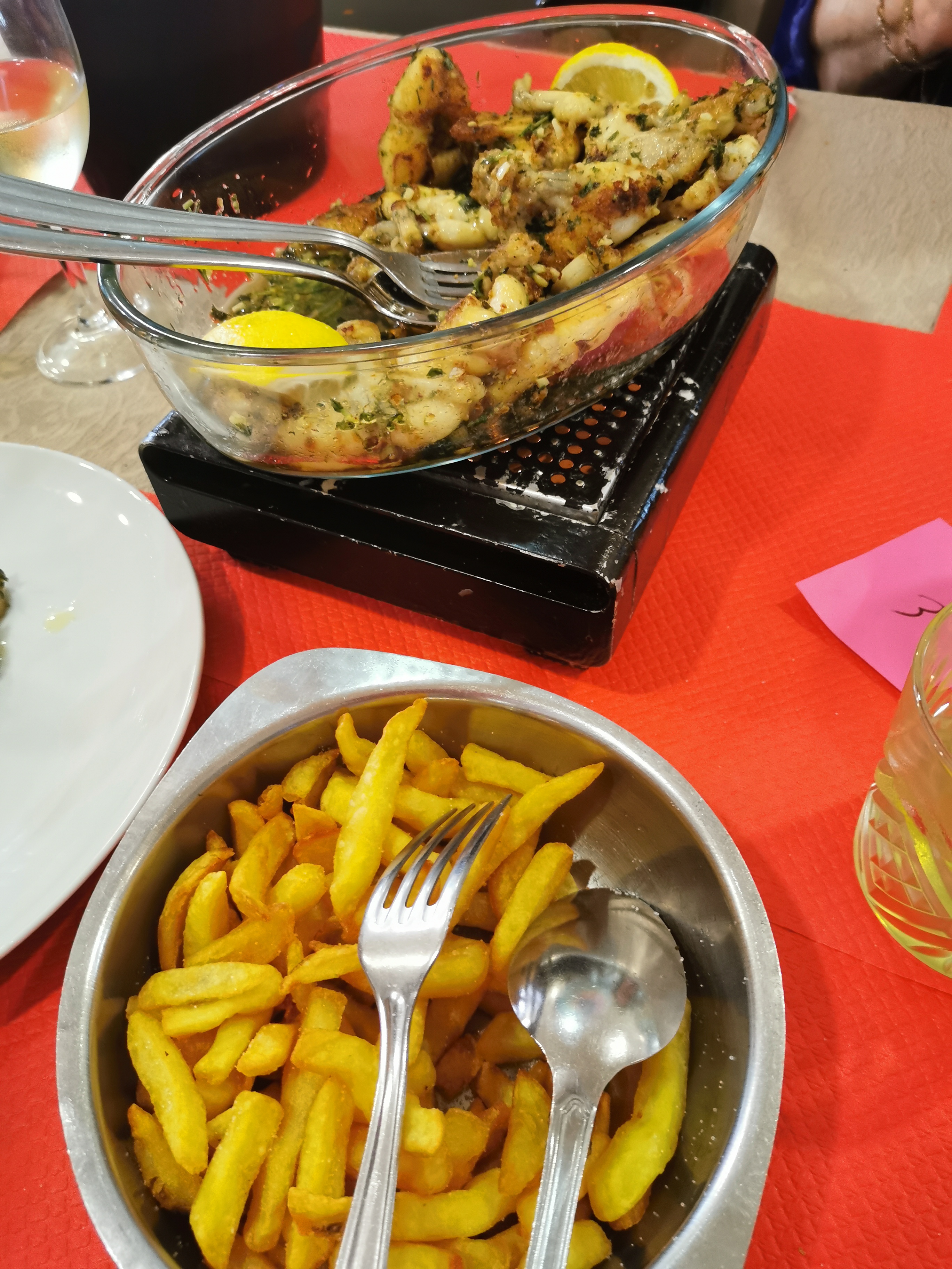 Salade de fruits de mer et friture congelées. Quantité trop importante, impossible de terminer, donc gâchis. Les fruits de mer sortis du congélateur ont certainement traînés avant d'être mis dans les assiettes sans être cuisinés et ont rendu 2 personnes malades, 1 personne a eu une éruption cutanée immediate qui s'est propagée sur tout le corps et la 2ème personne a eu une diarrhée très importante le soir. Restaurant à fuir.