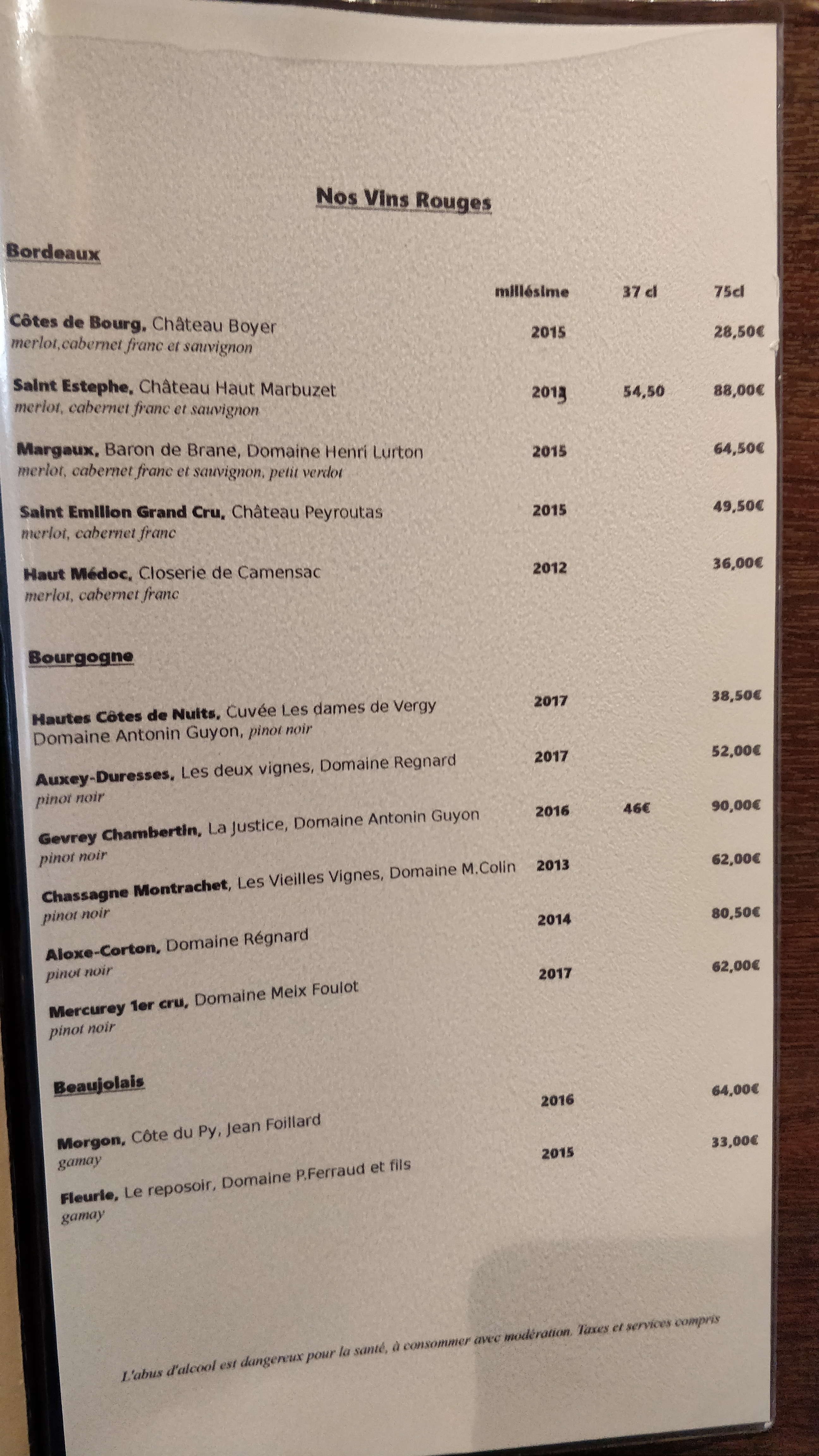 Il n’y avait que 2 tables occupées, ce midi là. On nous a remis 2/4 menus en anglais : déjà qu’en français les noms des plats sont étranges, en anglais c’était cosmique : nous avons gloussé plus que la pintade du menu découverte. Il faut dire qu’on avait tellement de mal à choisir entre l’oreiller et la drêche qu’on était convaincus d’avoir choisi le pavé de bœuf. Blague à part, la cuisine est honorable et les vins exquis. Ne prenez pas la carafe d’eau : le goût de chlore vous détruirait les papilles. Le faisant remarquer, on m’a rétorqué ce c’était le calcaire qui avait ce goût de chlore : encore une blague du menu.