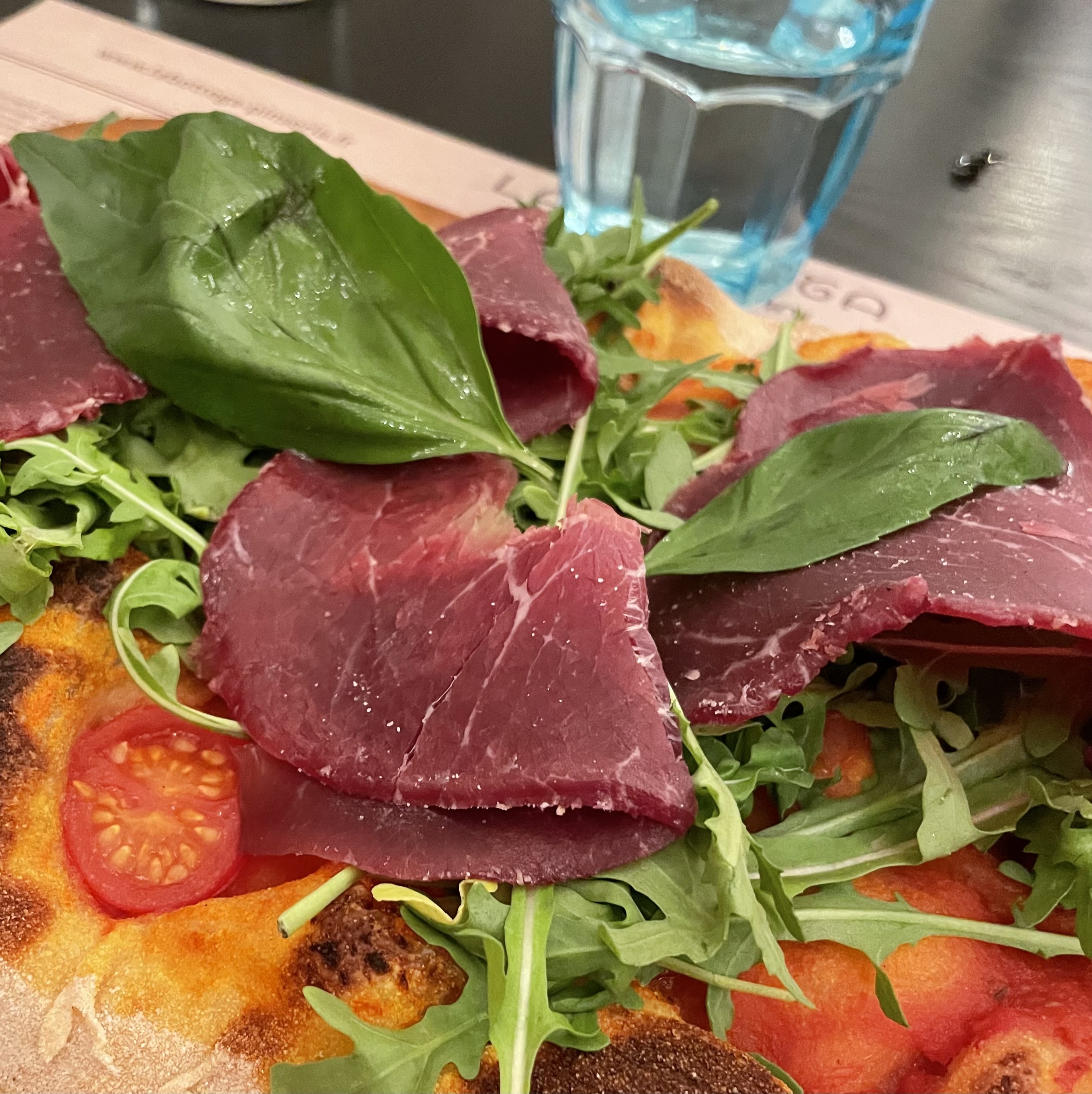 Pinsas a se rouler par terre ! Fine pâte à pizza cuite garnie d ingredients crus de grande qualité. Adresse incontournable