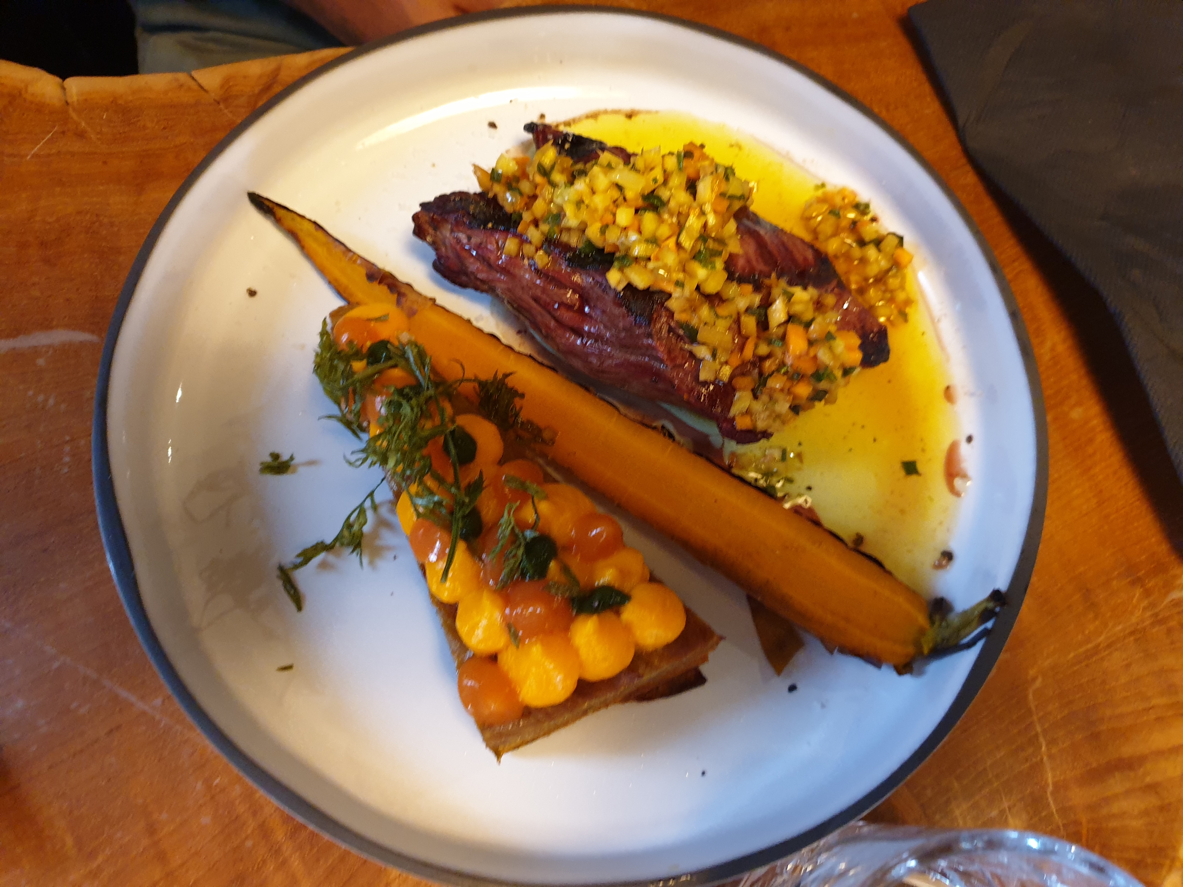Un cadre sympathique pour une ambiance cosy et une petite carte assez recherchée. Juste un petit bémol sur la cuisson de la viande qui n’a pas du tout été respectée, c’est dommage. Le reste était vraiment excellent et les assiettes étaient également très belles.