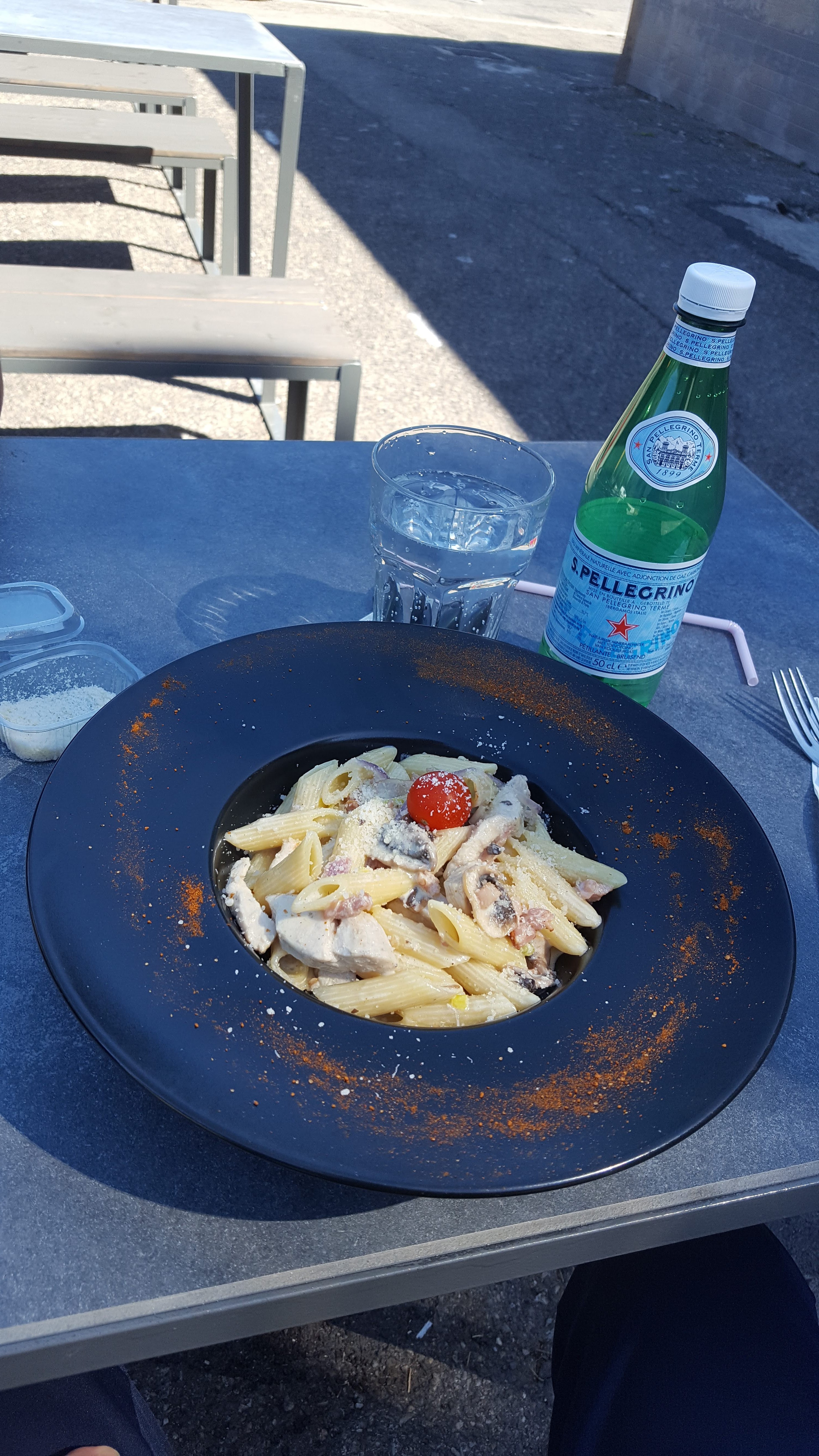 Tellement on avait fait et que tous donner envie on a pris un peu de tous et cetait super comme les gens labas tres gentil. Et le service super rapide pour tous ce qu'on avait pris lol La pizza méditerranéenne crème top Les pâtes au fruit de mer trop bon Et l'assiette a emporté multi viande et c'est accompagnent le parfum le goût tous y était 👍👍👍👍 Je recommande a 100% Sa change des snacks car faut pas ce mentir si tu veux manger halal généralement c'est snack ou fast-food Et la vous ce que vous proposer de différents des autres les viandes cuit au feu de bois les pâtes les bruchetta etc C'est votre force continuer comme sa .