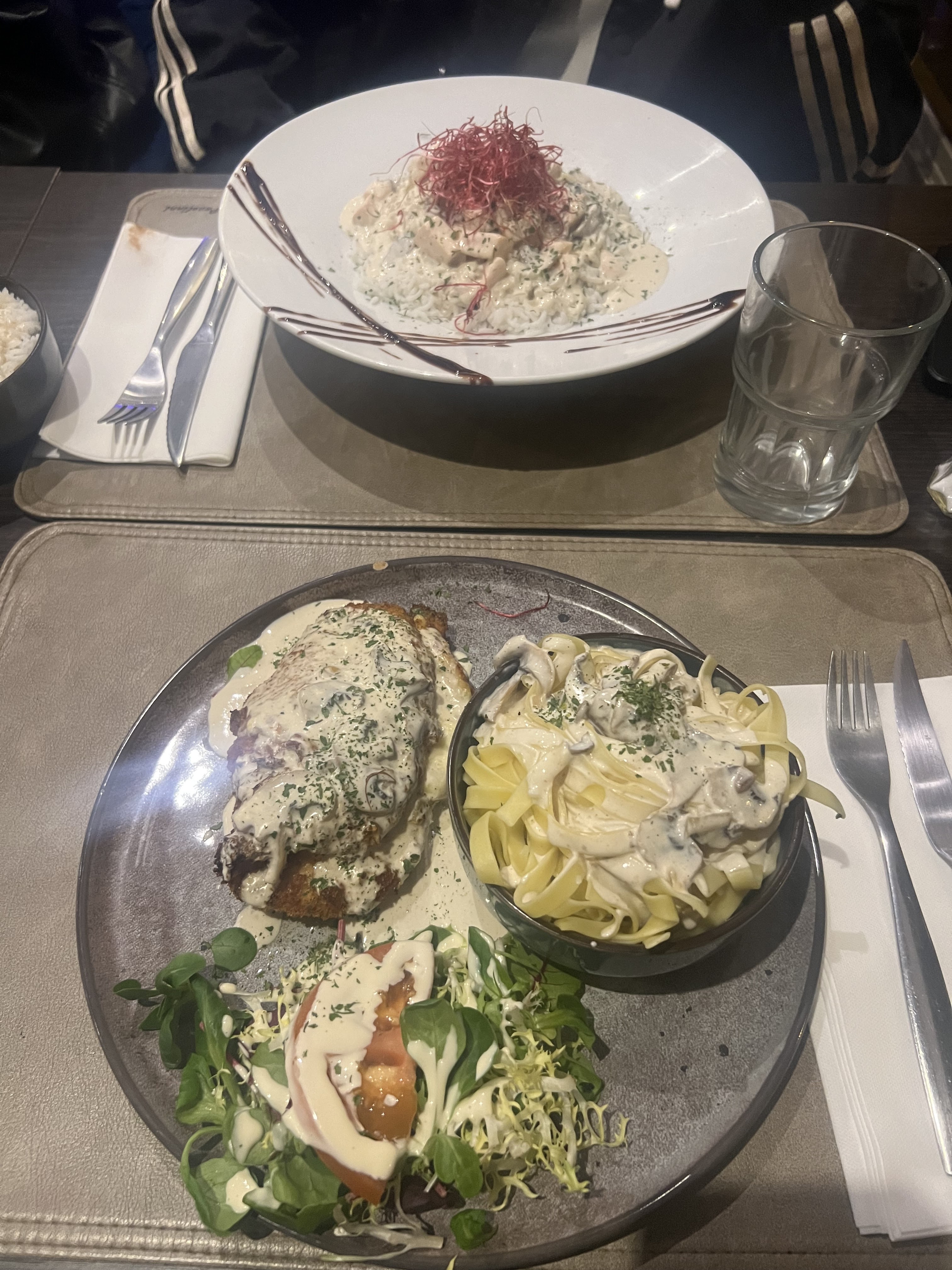 Nous avons mangées avec mon mari pour ma part les tagliatelles de saumon étaient bonne et mon mari a pris cordon bleu savoyard avec pâte à la crème et frite en supplément, malheureusement les frites avait un goût bizarre je pense que c’était l’huile. Mise à part ce petit bémol c’était très bon, l’accueil est super la salle est plutôt mignonne.