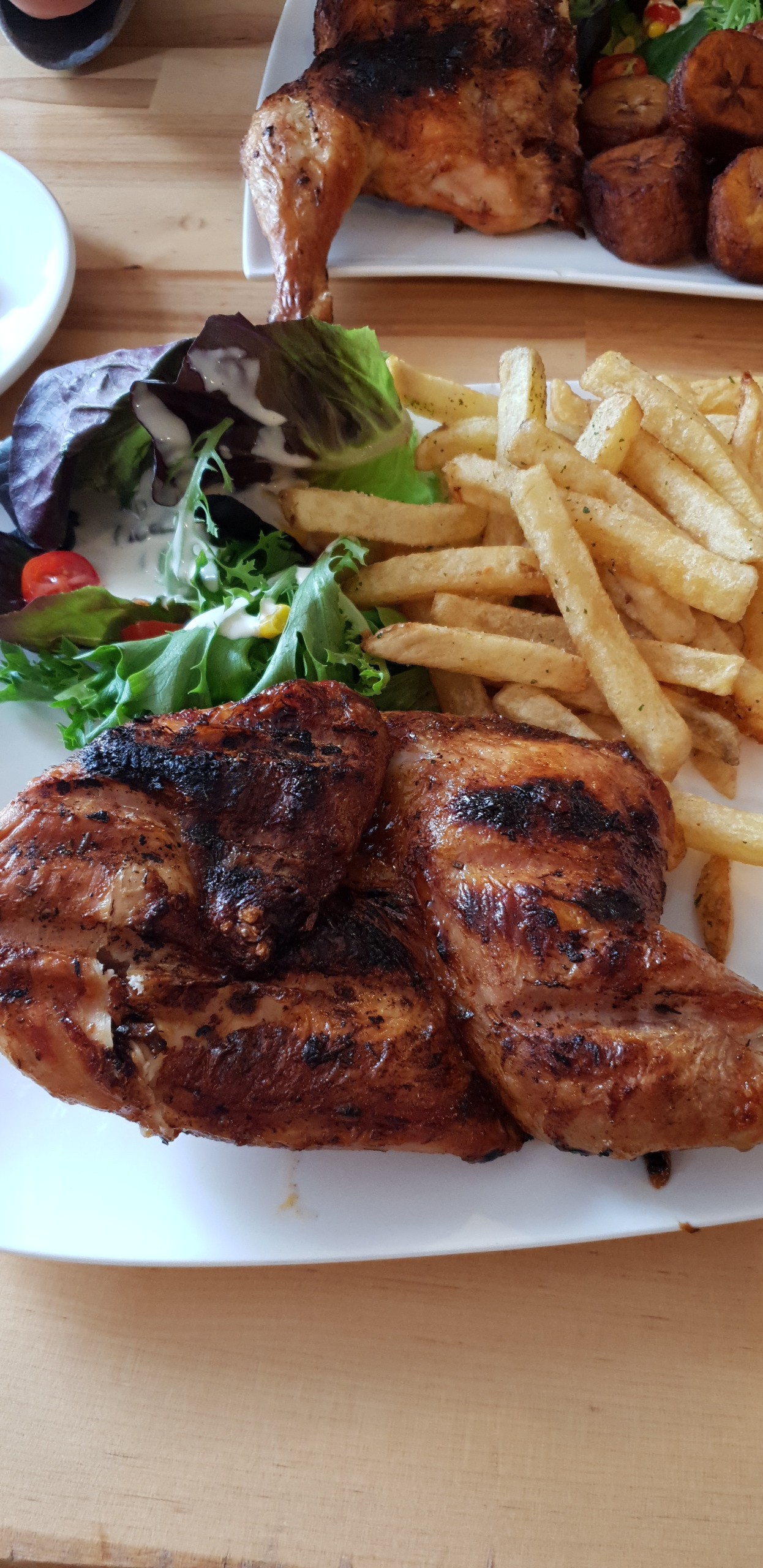 Simple kom repas maiq très bon le poulet est bien cuit et les patates plantin délicieuses, tout comme les frites maison... la qualité du service er l'accueil sont également au rdv. Je recommande cet endroit !