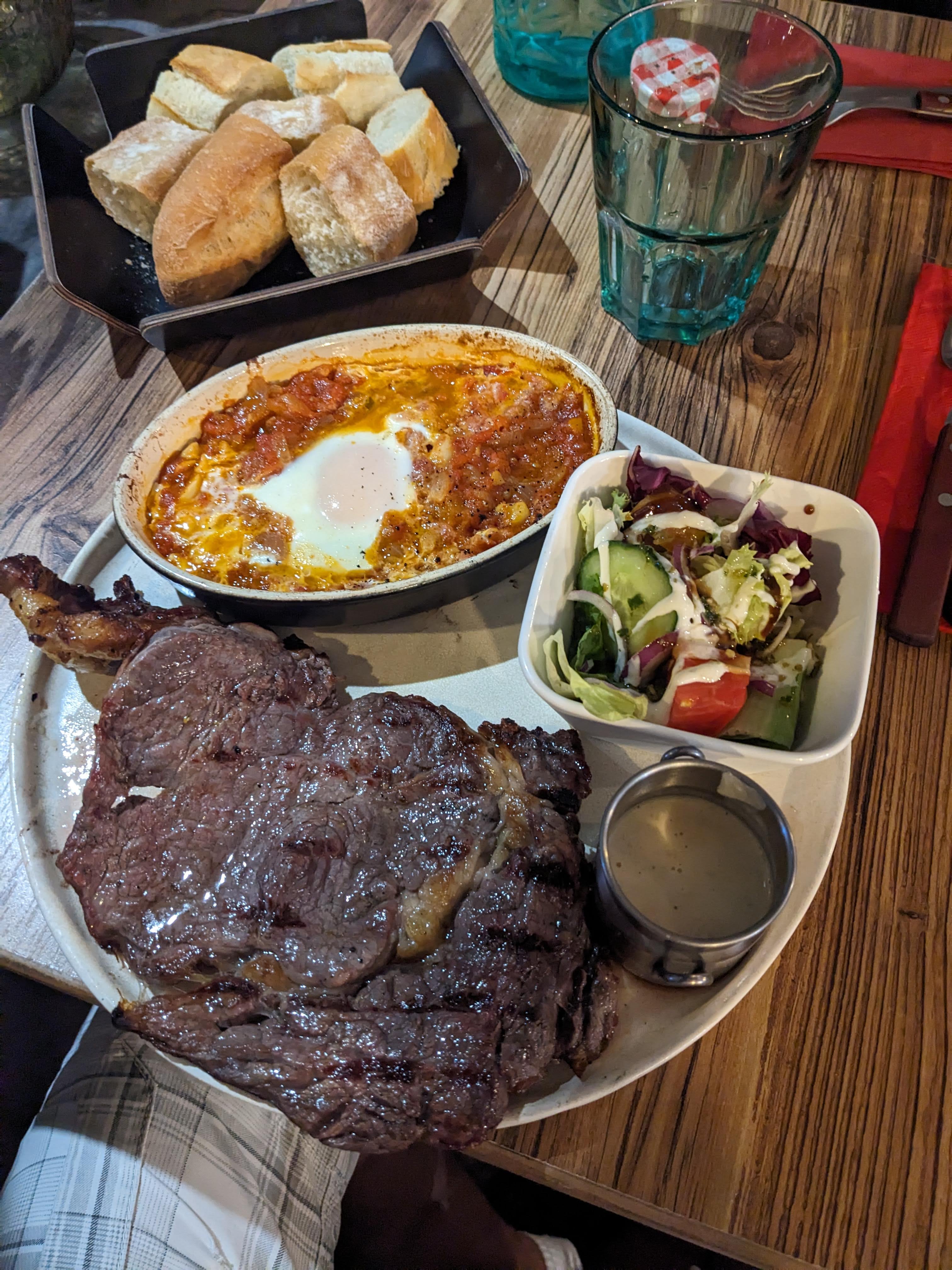 Succulent, pour une fois mes yeux étaient plus petits que mon estomac mais j'ai tout fini. Il y a du choix et le mien s'est porté sur l'entrecôte accompagnée de la choukchouka (pimentée) et en entrée Guacamole.