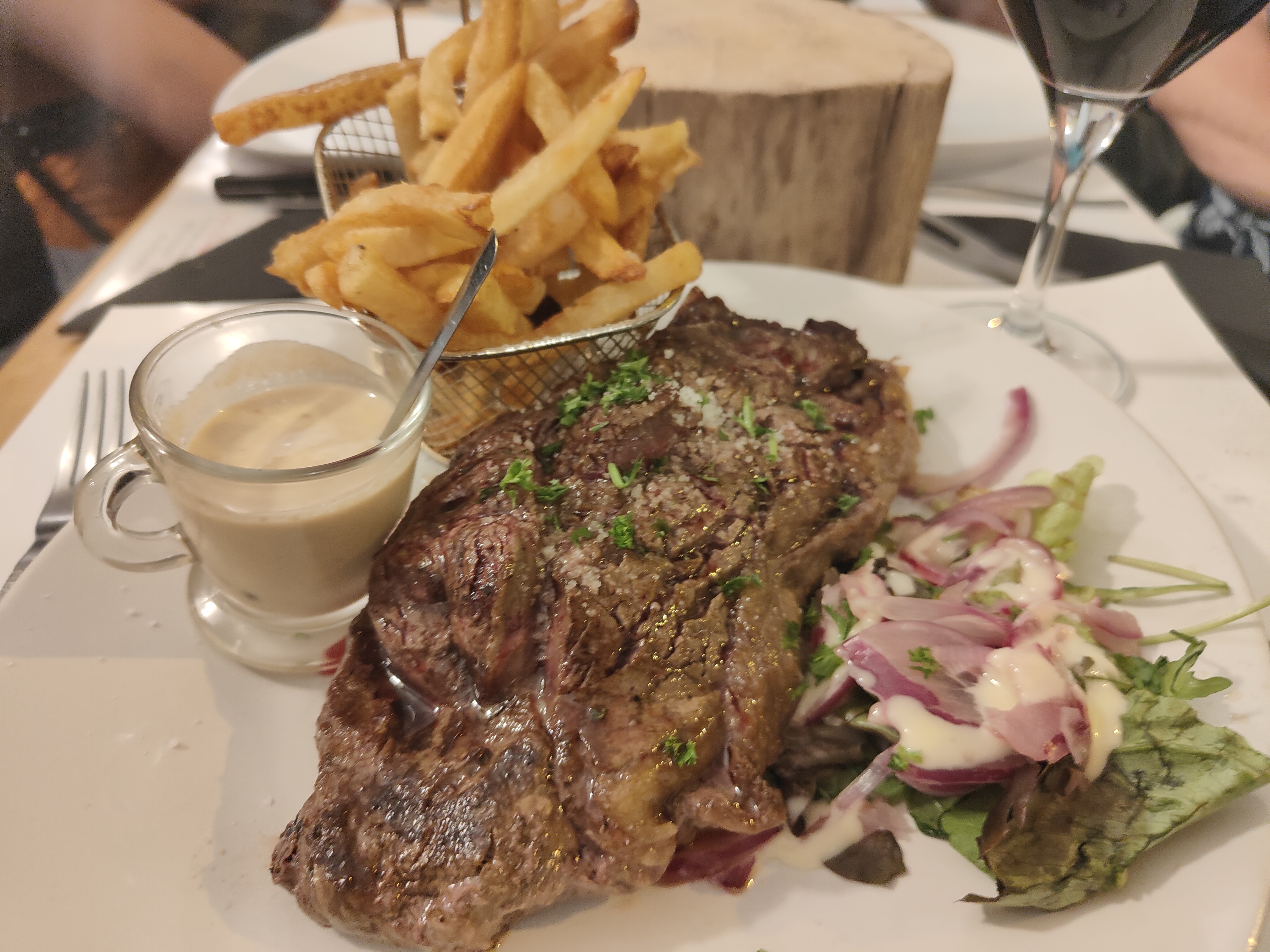 Malheureusement, le steak était très moelleux et restait coincé entre mes dents. C'est probablement ma faute si j'ai choisi une entrecôte mais pas géniale. Le restaurant était vide et sans âme. Le serveur semblait totalement ennuyé et attendait de rentrer chez lui.