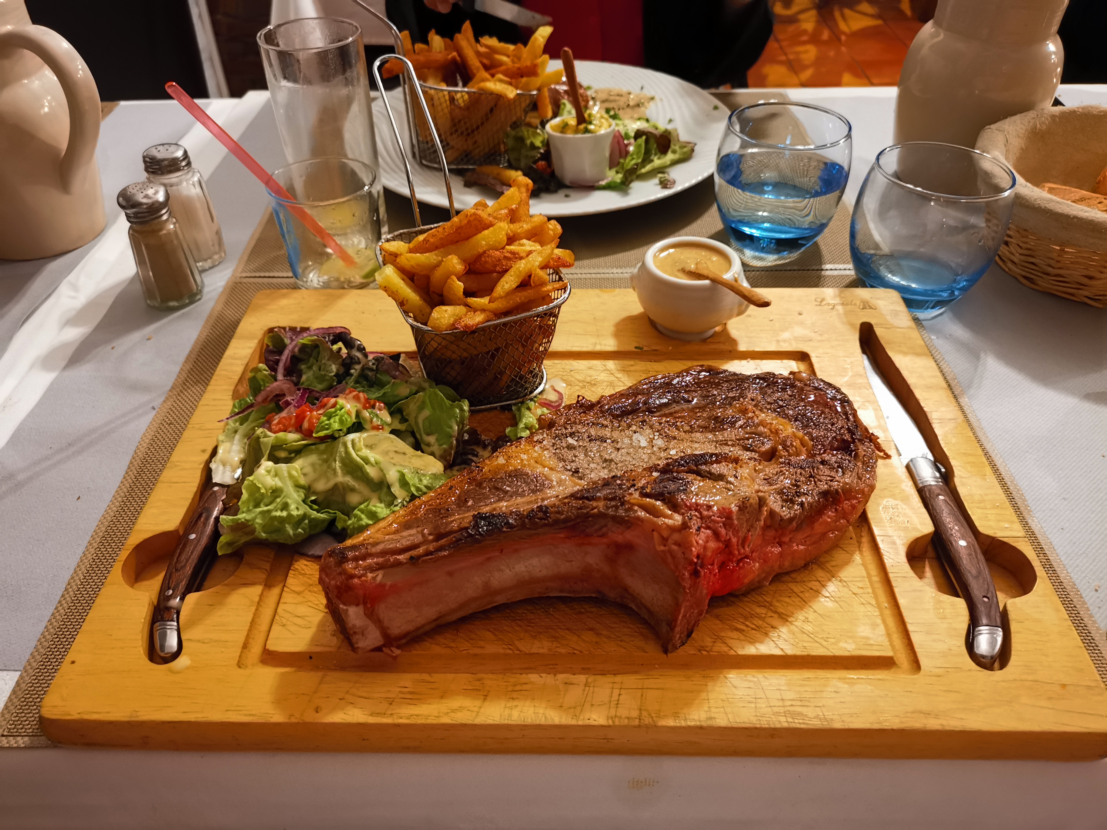 repas agréable la viande est bonne mais dommage pour que la bouteille de vin servi avec le repas côte de bœuf soit de qualité insuffisante