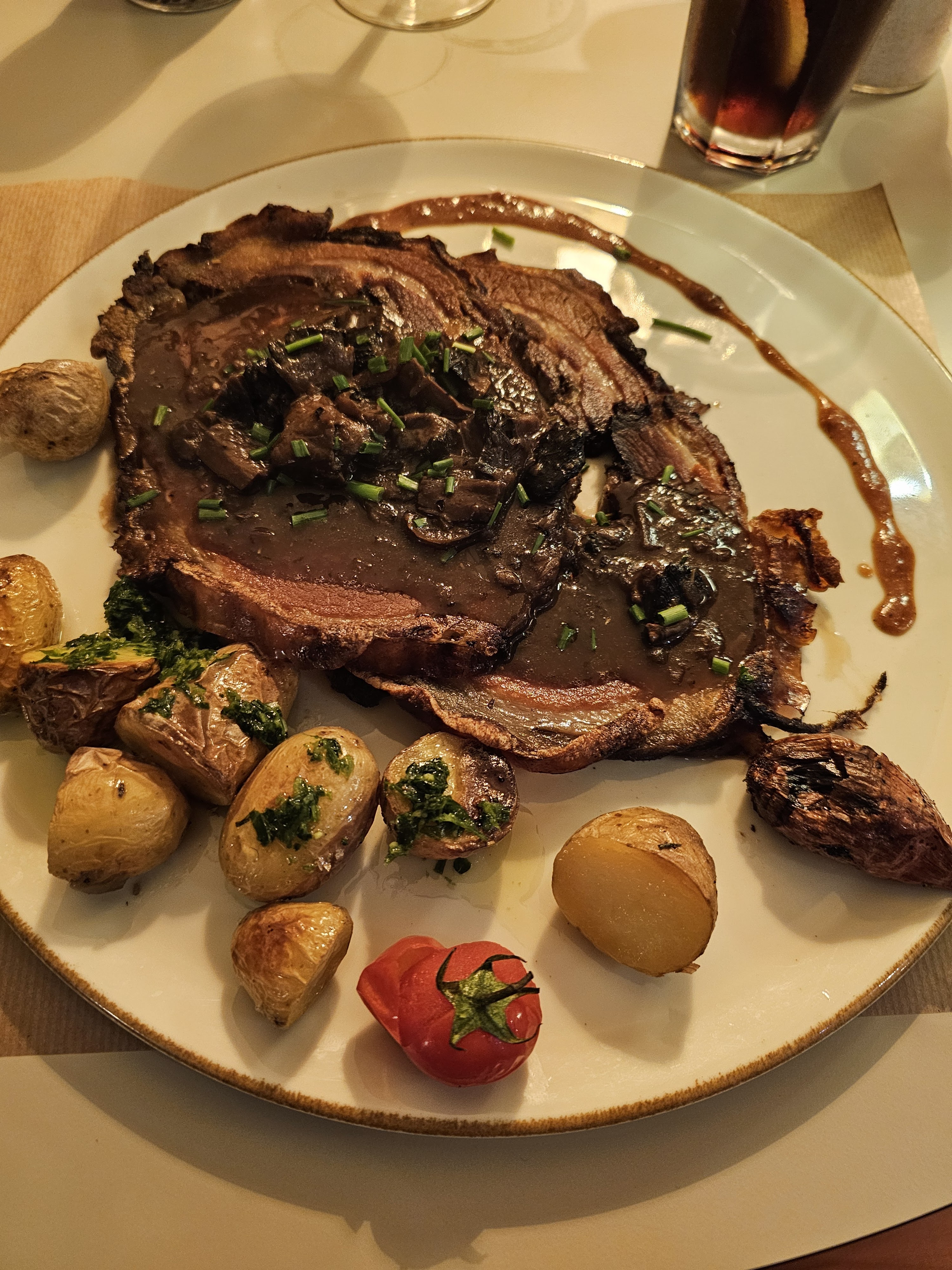 Personnel pro et attentif malgré notre arrivée sur les coups de 22h. Nous avons pris le Mix de viandes de bœuf braisées pour 2. Cuisson parfaite. Je recommande.