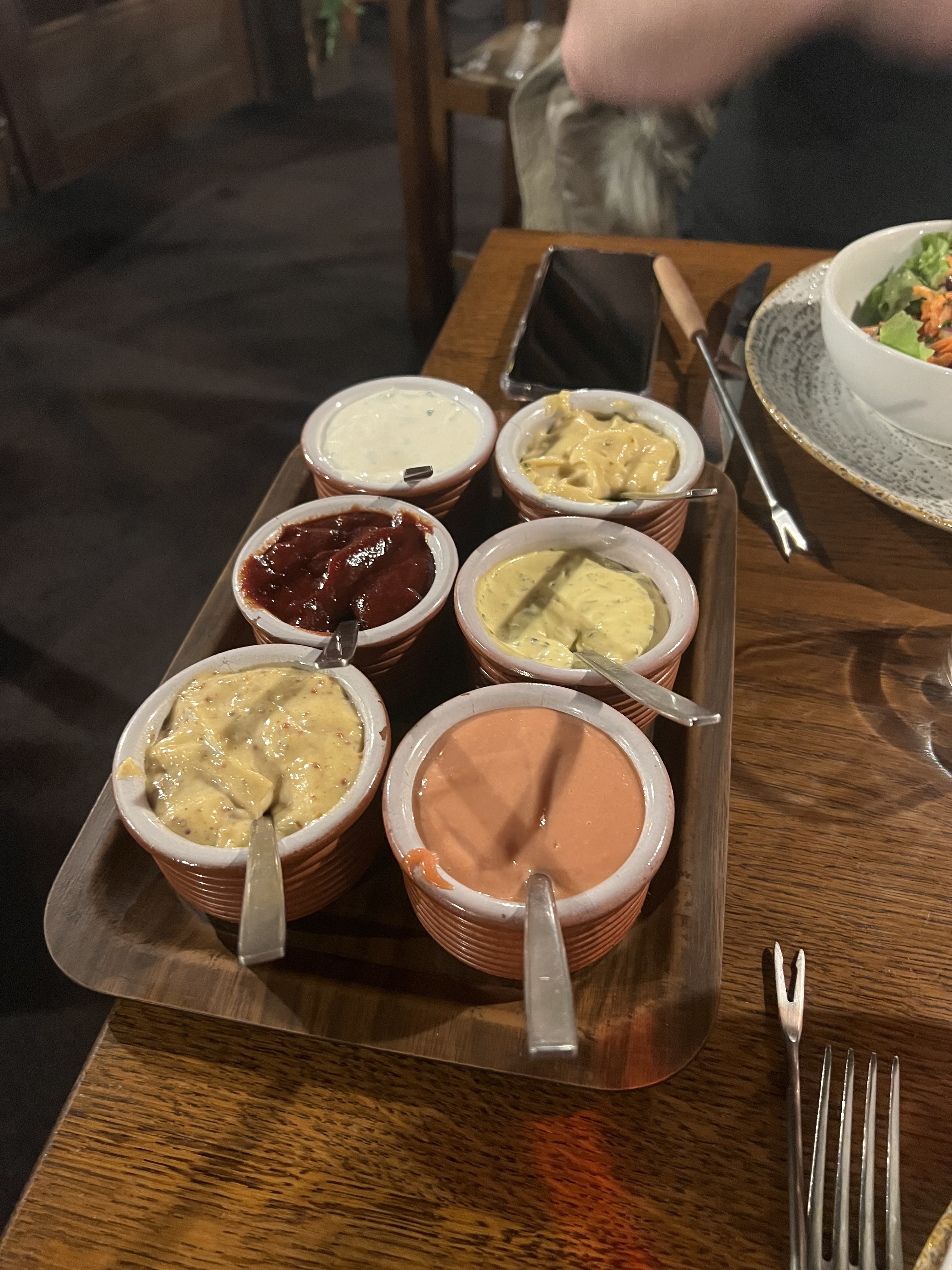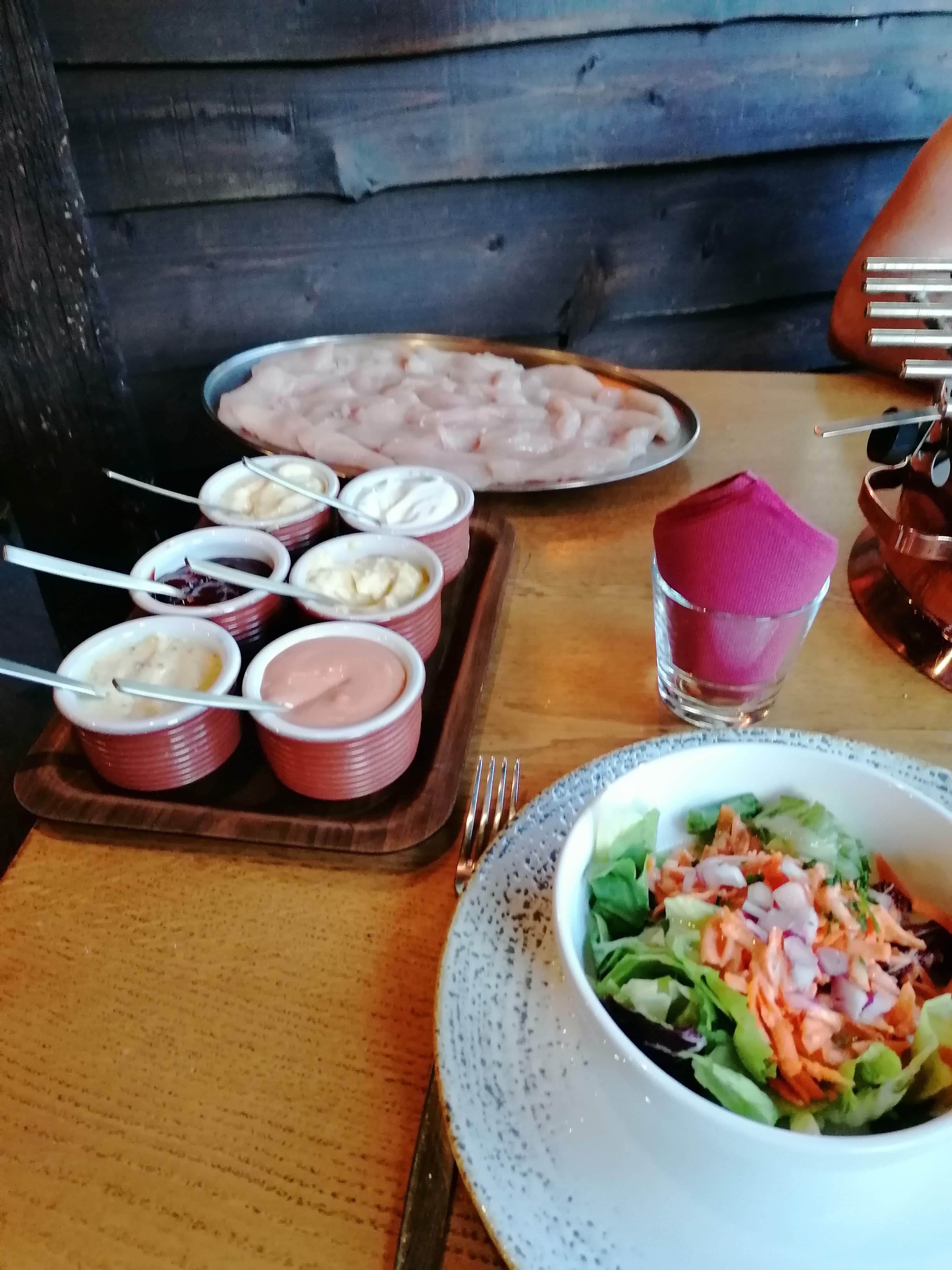 Ambiance sympathique, viande de bœuf très tendre, sauces diverses pour notre fondue au vin blanc (boeuf-poulet) déjeuner juste parfait accompagné d'un très bon beaujolais Merci car c'était une parenthèse très agréable et délicieuse Nous recommandons ! Il y a même du choix pour les non-viandards et notamment de très belles salades à la carte, tout donnait faim.