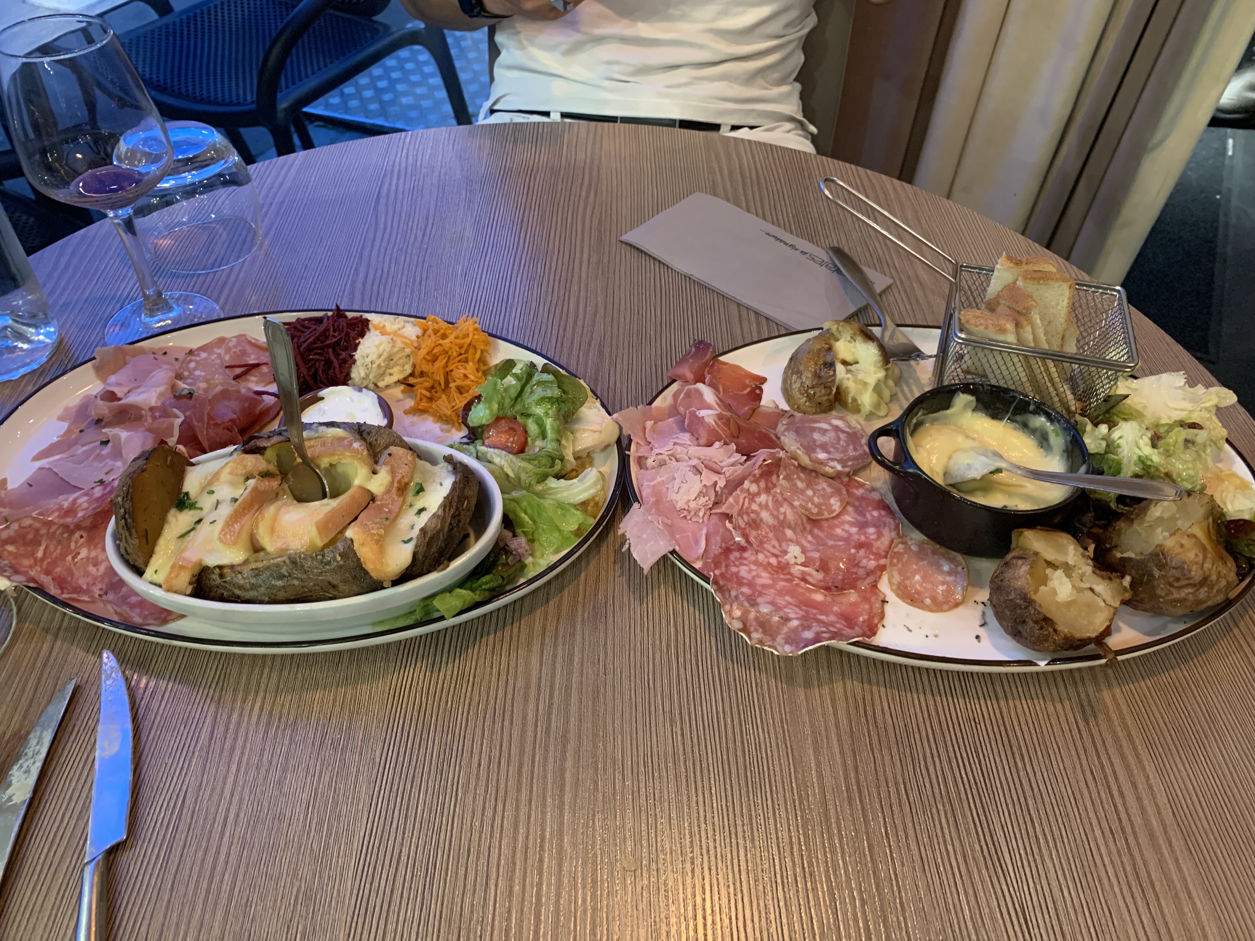 Nous avons pris une tartiflette de saumon et un tartare de bœuf. La tartiflette vaut le coup, le tartare beaucoup moins, car il était accompagné d'une dizaine de frites incurvées, que vous trouverez classiquement dans beaucoup de brasseries ( cherchez metro frites steakhouse ). J'aurais aimé voir un effort supplémentaire sur les frites pour un endroit qui s'appelle 100 patates