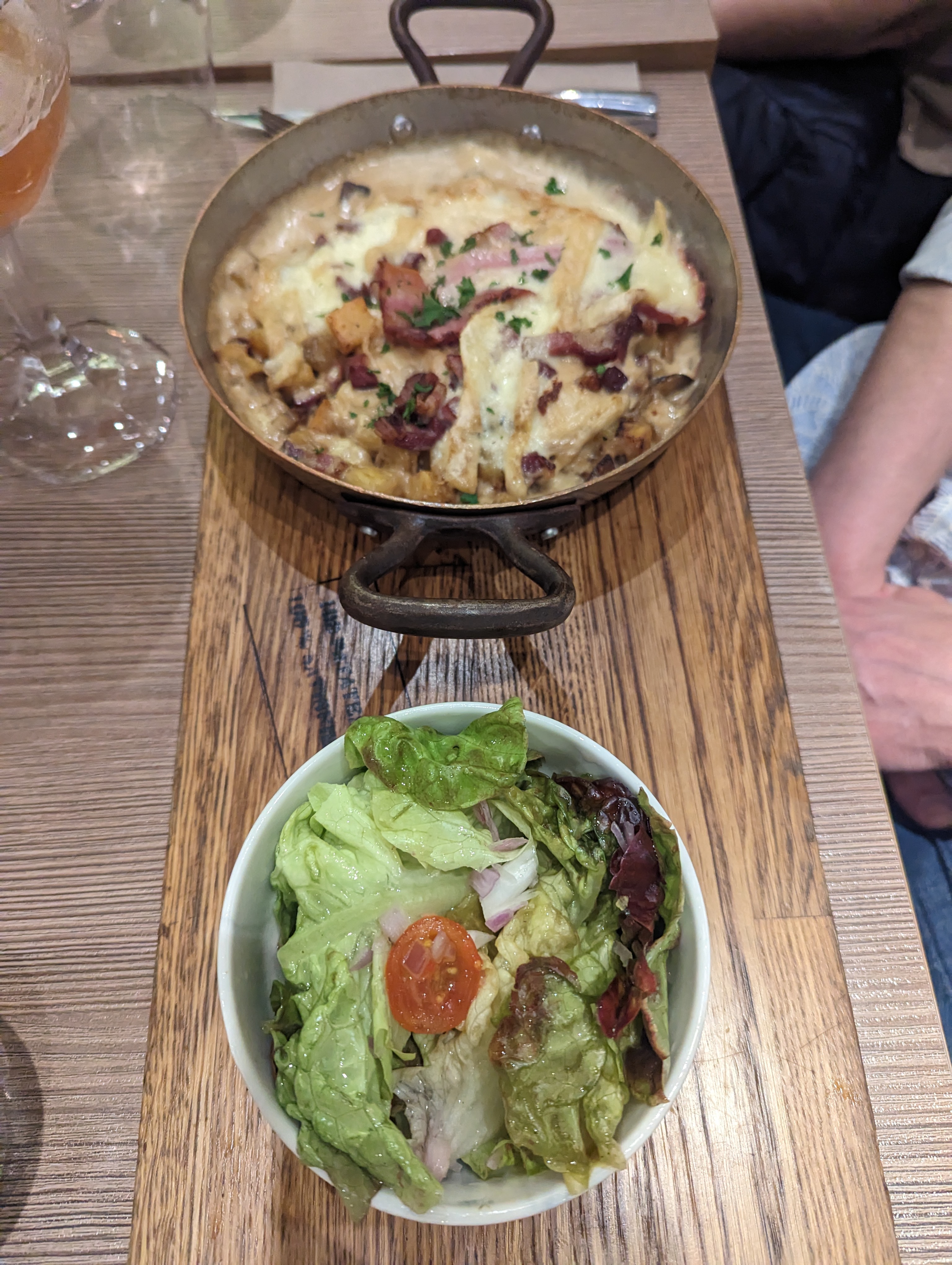 Restaurant dont le concept et la décoration sont sympas. Après, la cuisine est décevante. Les gratinées raclette sont préparées à l'avance et quand c'est servi, le fromage est tiède et déjà solidifie. Les ingrédients ne sont pas de bonne qualité. Le jambon de pays a un goût de plastique. Le céleri n'a pas le goût de céleri. Côté fondue savoyarde idem. Dommage. Et pourtant 39€ pour 2 personnes rien que la fondue. Le service est long et le serveur peu aimable. Nous ne recommandons pas.