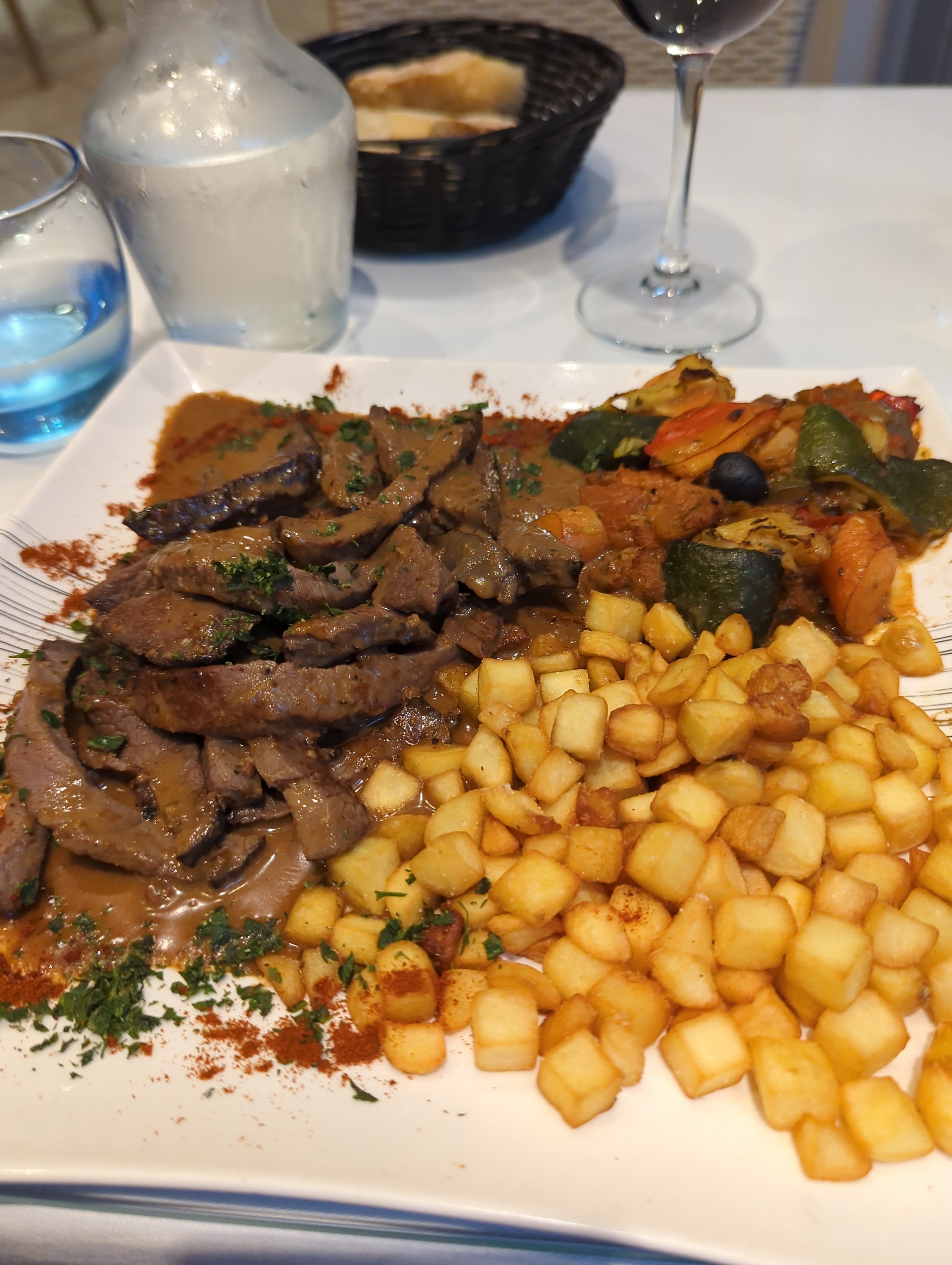 Le hasard fait de bonnes choses Pas grand monde on s en fout en essaie Comme quoi cela veut rien dire Diner à 2 sal de chevre chaud j ai demandé une salade mixte et j ai une mixte superbe avec poivrons et oignons rouges marinés excellents Filet de loup avec une très bonne sauce Ratatouille confite et rognons comme la cuisine d avant ALLEZ Y !!!! Le soir y a pas grand monde dans cette rue difficile Prix très abordable Service sympa Bonne musique belle déco On reviendra ça c est certains Ce restaurant doit se relancer repris par des professionnelles depuis 1 an ALLEZ Y!!