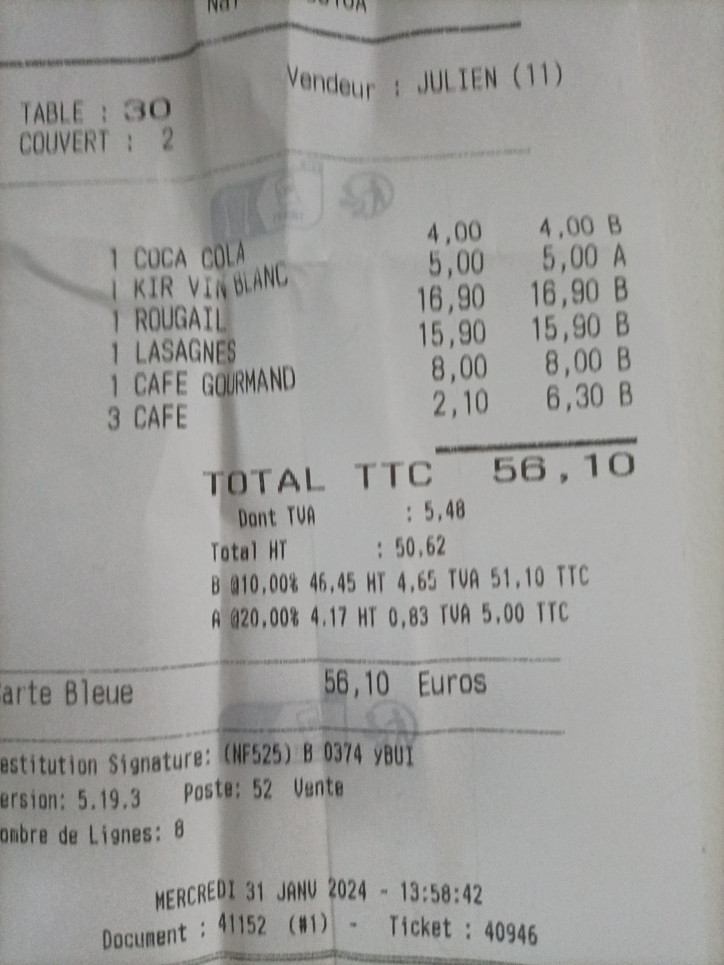 Les plats étais bon , l’entrecôte étais pas bonne avais un Gout de passer et sentez mauvais du coup nous appelons le serveur pour lui dire il reprend l’assiette et nous demande ce que nous voulons à la place mes avant il nous dit quand même qu’il l’a goûter et que ça allait ce qui m’étonnerait qu’il es goûter dans mon assiette car étant dans la restauration je n’est jamais vue un de mes collègue manger dans une assiette qui nous étais revenus ! Au moment du paiement ces inadmissibles que ce soit nous client qui devons faire les calculs alors que c’est à lui de le faire qu’il y es du monde ou pas !