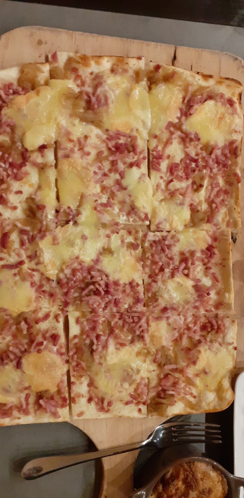 En ce qui concerne les plats , nos 3 choix ont été apprécié soit moules à la fourme frites / flammekuch veggie/ grande salade gourmande 👍 Les frites bien bonnes Pour les desserts , je ne peux donner d'avis puisque aucun nous a donné l'envie de se laisser à la gourmandise. Apéro sympa, ils offrent un micro verre de petits gâteaux apéro. La terrasse est plutôt agréable , côté soleil couchant 👍 Du monde en terrasse . Niveau confidentialité c'est pas le top top mais on ne recherchait pas cela non plus .