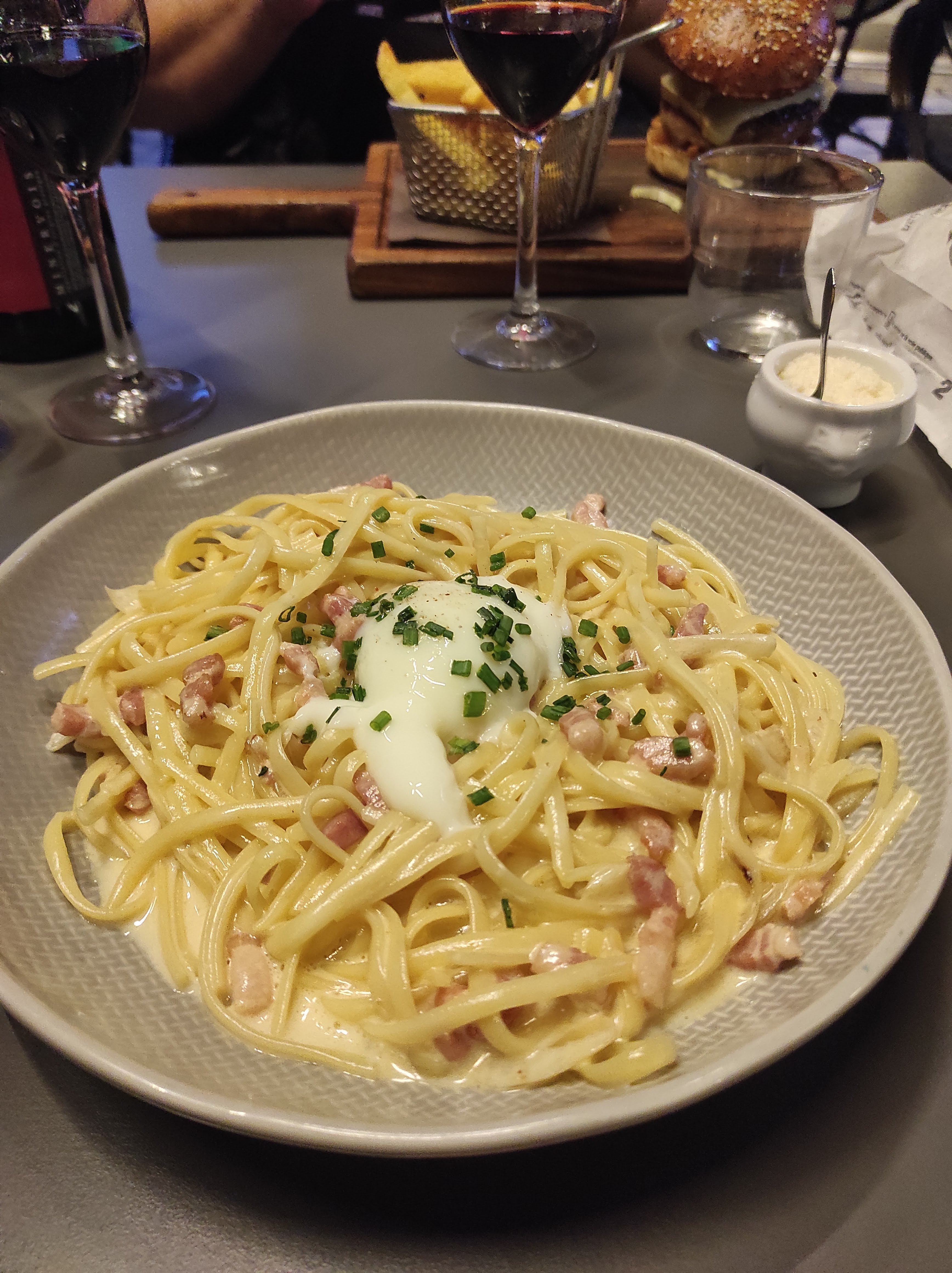 Déçue,un lieu trop mouvementé pour manger tranquille en terrasse,des bandes de copains bruyants débarquent à tous moments,se claquent le dos comme une fin de match,quel tournis ! Déçue des plats commandés ,un burger de canard avec en pièce principale,un steak de canard haché grossièrement,(quelle erreur de technique culinaire,de la viande confite ou du magret coupé fin aurait mieux fait l'affaire)surtout avec un morceau de foie frais,la belle et la bête,un pain burger sec,des frites trop salées bref, à éviter. Et des linguines carbonara à l'oeuf parfait,et ben non ,trop cuit😟 Tentez de mettre un vrai Chef en cuisine,le bling le bling ne dure pas.