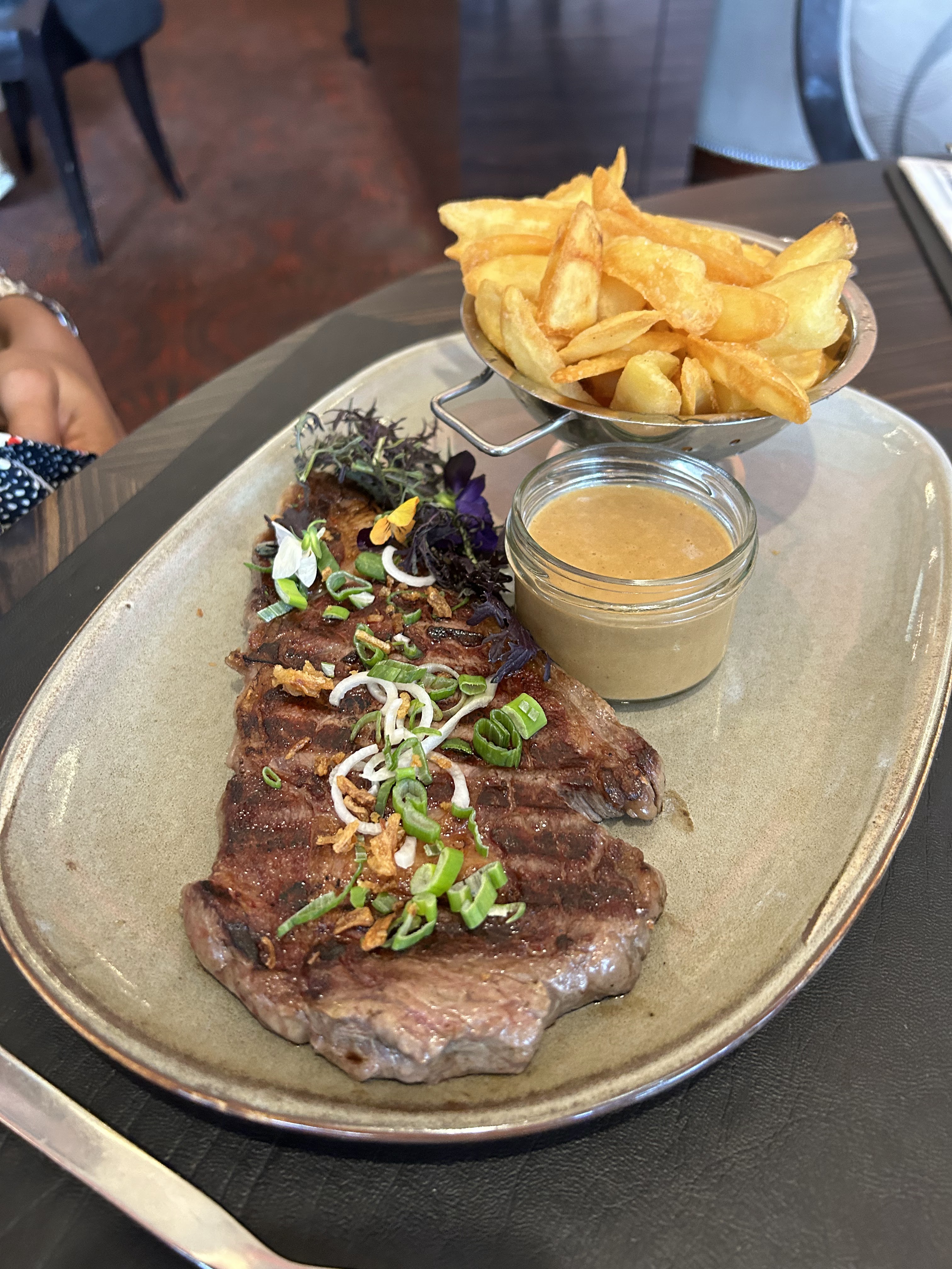 Un cadre de rêve. Une bonne ambiance. Des plats qui arrivent dans une belle assiette avec une belle présentation et des goûts exquis. Un serveur et une serveuse très agréable et souriants. Je recommande vivement mais n’oubliez pas de réserver cela sera mieux.