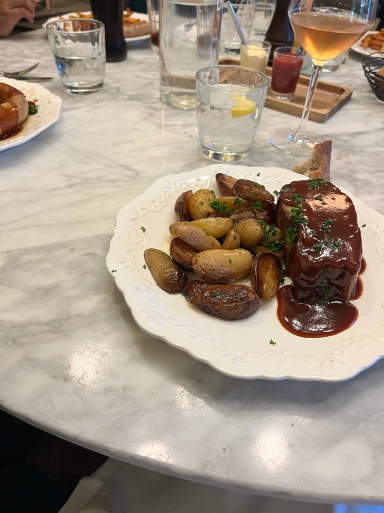 Service un peu long alors que nous somme que très peu. Pas de formule de proposé ce jour là. L’onglet très bon mais les pomme de terre sans plus aucune sauce servi avec. L’entrée aucune sauce pour accompagner les endives. Pas de climatisation donc très chaud. Un peu cher pour le rapport qualité prix. Mais très bon service.