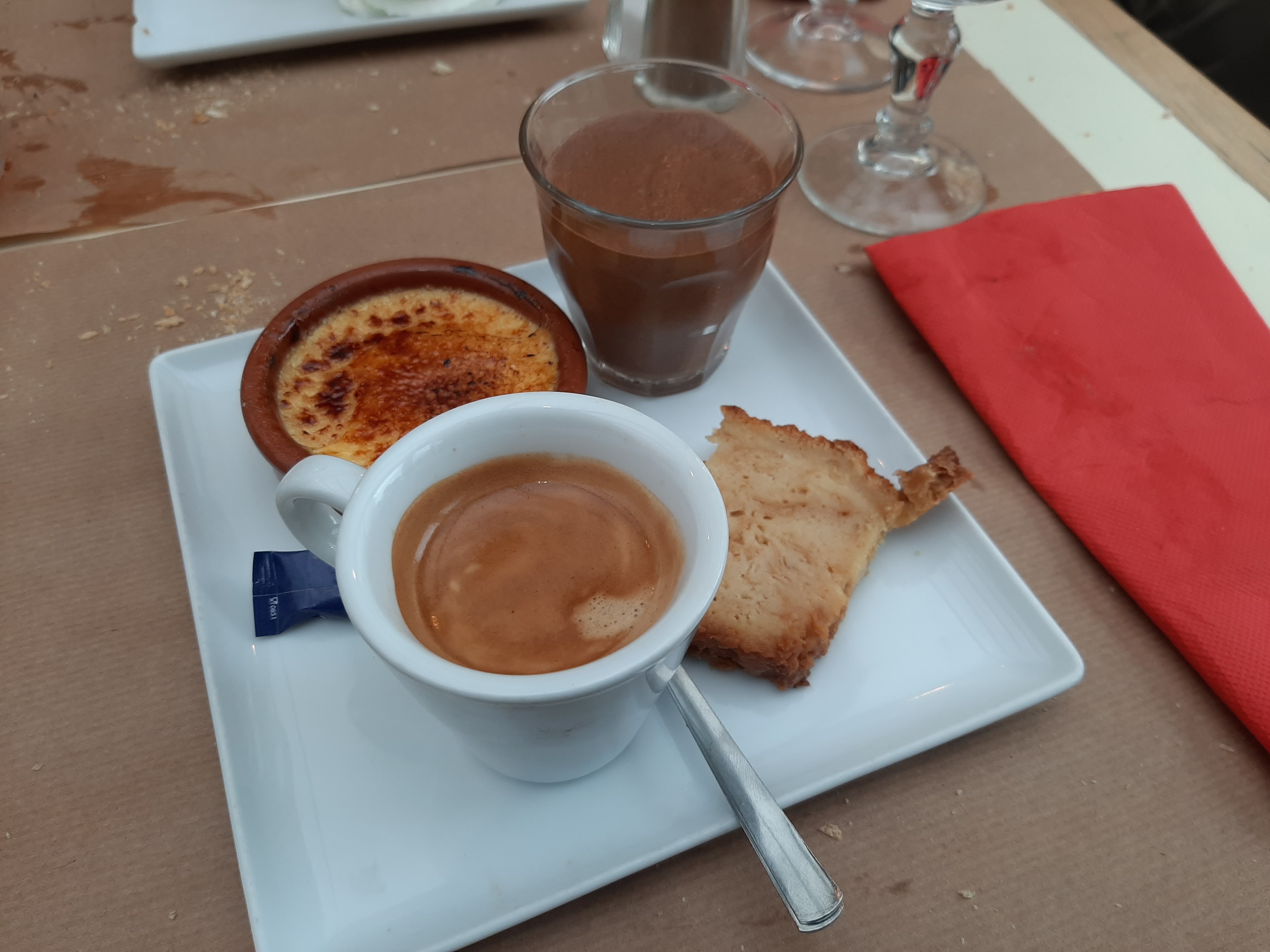 Service very good and plated food very generous. Café crème et mousse chocolat délicieux, merci. Hard wooden chairs uncomfortable though.
