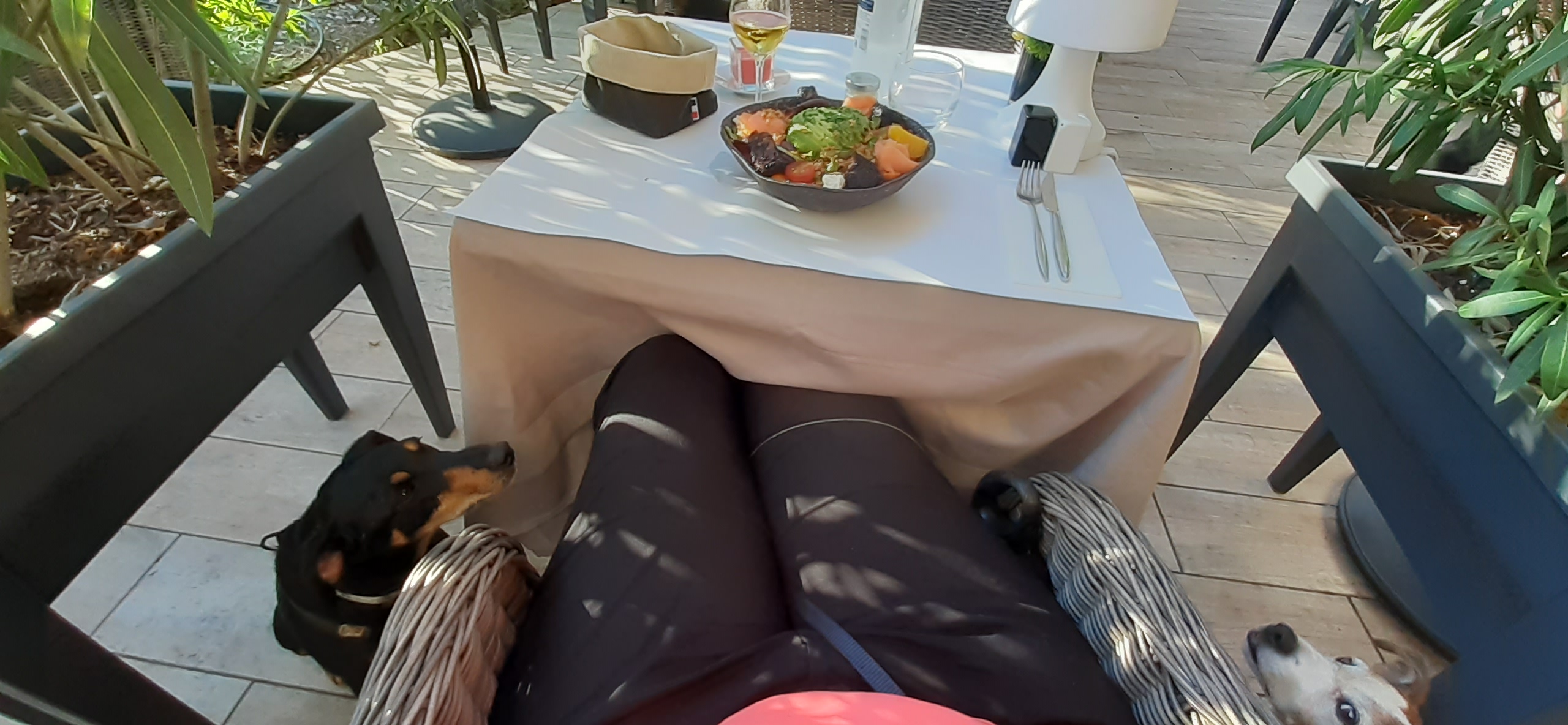 Très bonne salade. Personnel poli et attentif. Espaces, ombragés ou non, j'ai apprécié que les tables soient séparées avec de la végétation. Seul bémol : pas de prix sur la carte des desserts sauf celui du café gourmand. Pourquoi ? C'est gênant de devoir demander les prix à l'oral. Suggestion d'amélioration : Proposez de l'eau aux chiens, surtout en ces fortes chaleurs, serait une attention (courante ailleurs) particulièrement appréciée.