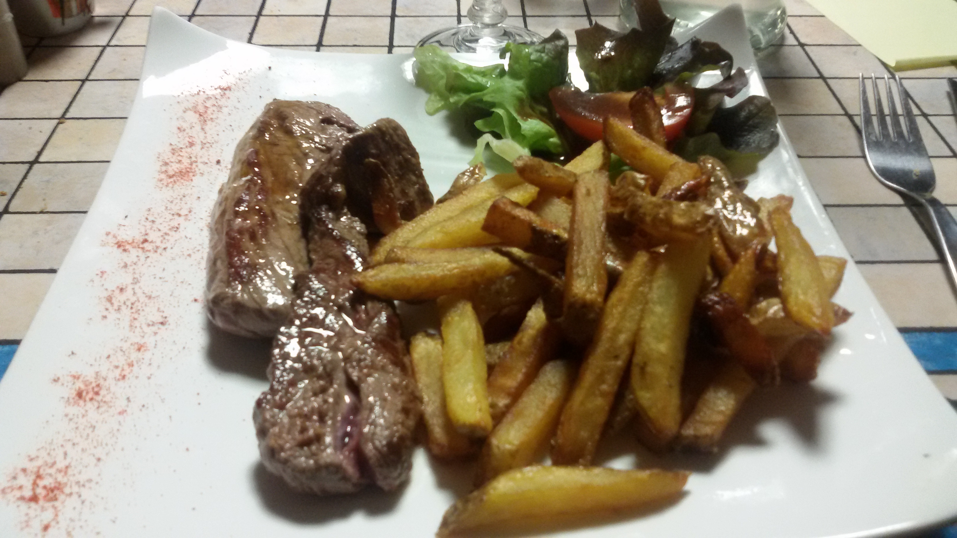 Frites réchauffées. Vin 7 euros pour 1/4 de vin.