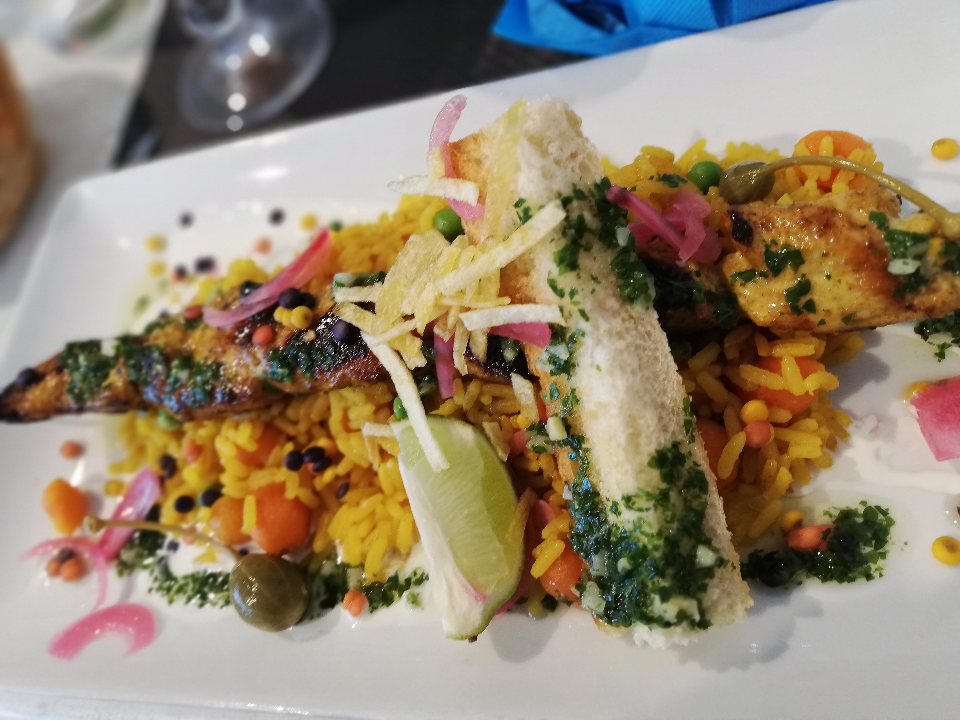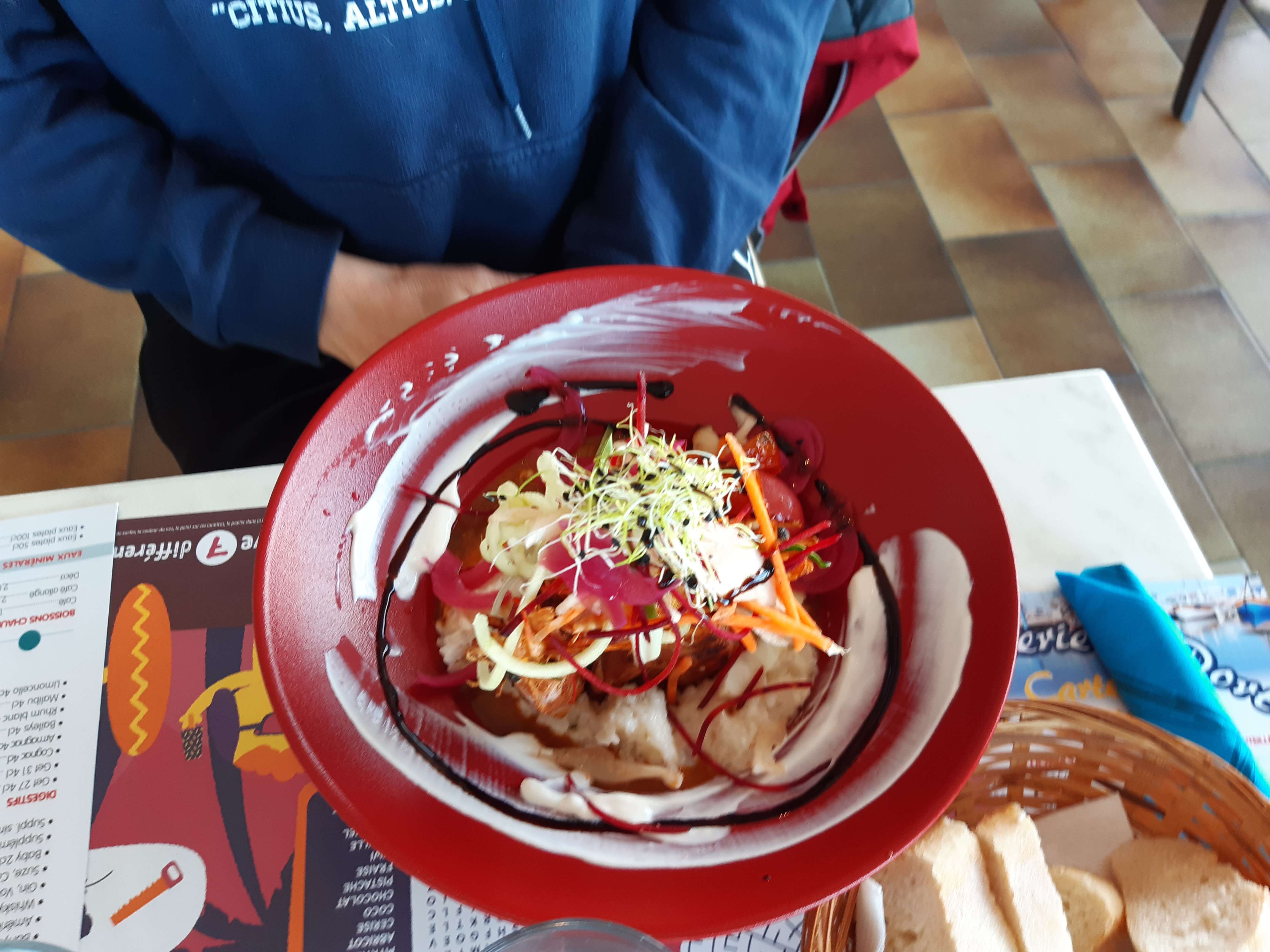 Cadre sympa, encore 1 terrasse fin octobre ! Une cuisine savoureuse et délicate, cuisson top de la brochette de poulet. Explosion de couleurs !