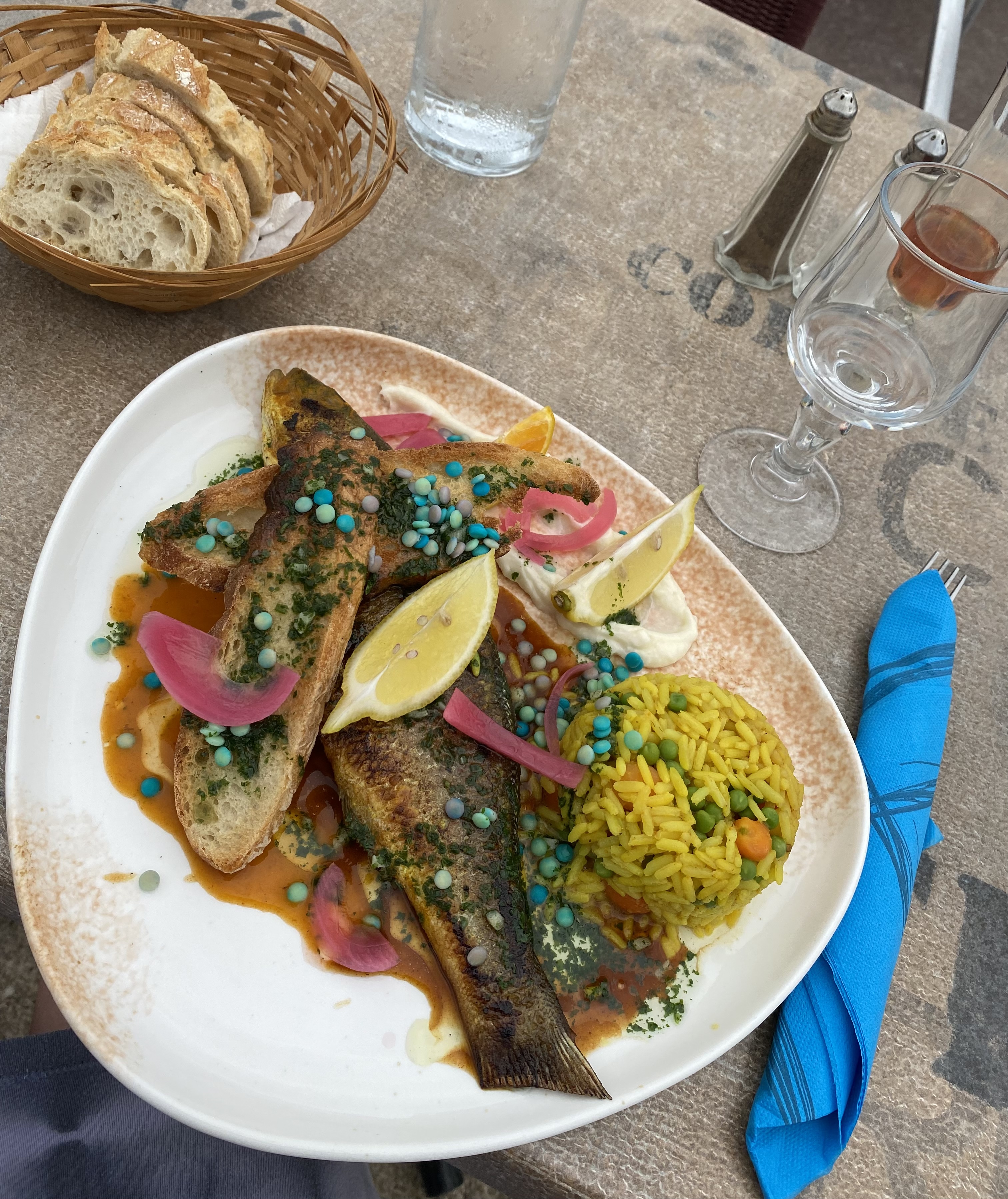 Trois fois cette semaine nous sommes allés y manger et trois fois avons été enchanté! Nous y avons trouvé gentillesse sourire patience une jolie vue sur le port calme. Des plats excellents du début à la fin. Une cuisine parfaite avec une cuisson parfaite. Que ce soit encornet 🐙 gambas 🦐 ou mulet 🐟 venant de la criée du matin Je recommande vivement cet endroit.