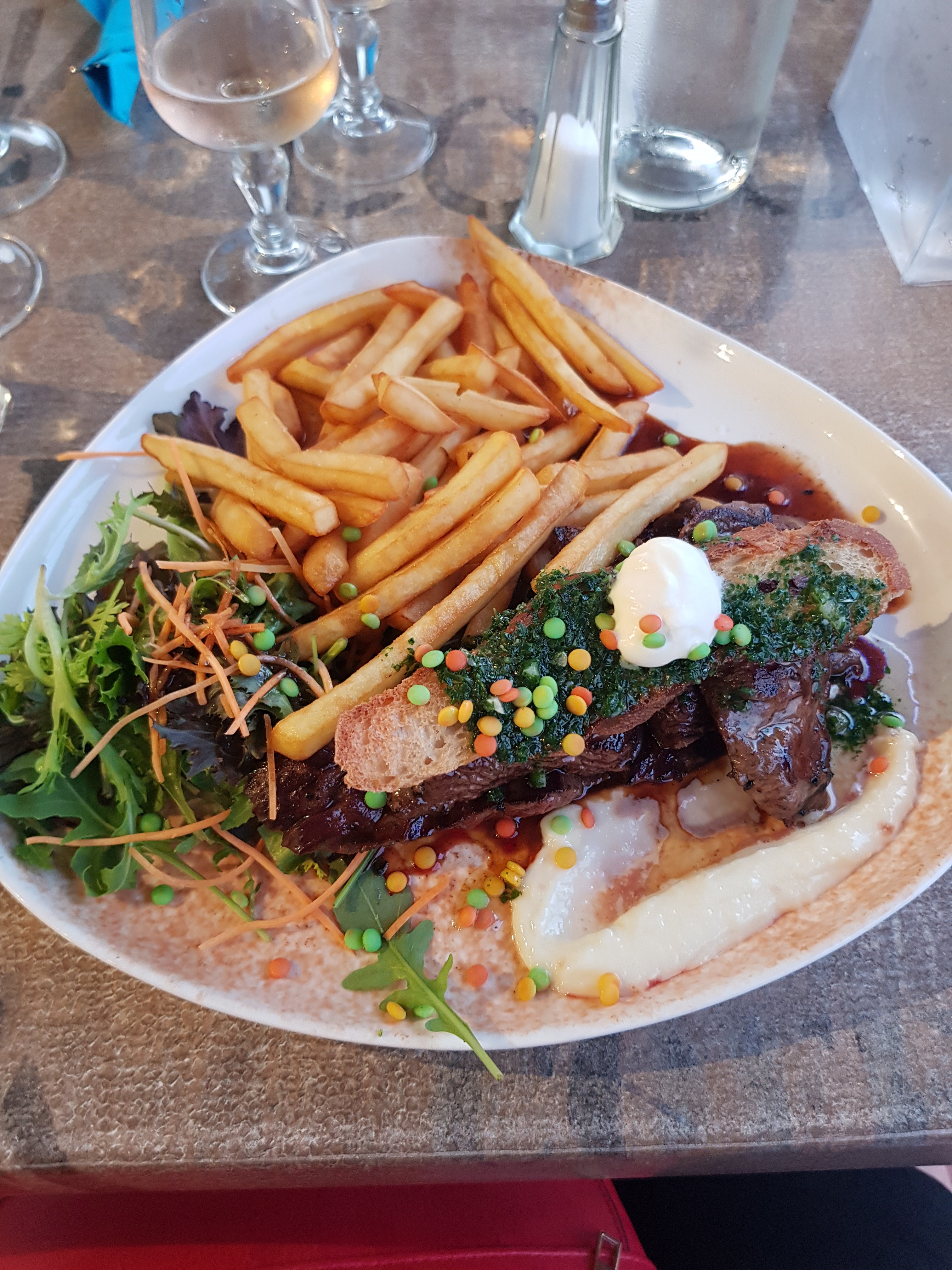 Nous y avons mangé ce midi. J ai pris un poisson entier et mon mari, une bavette. Tout était délicieux