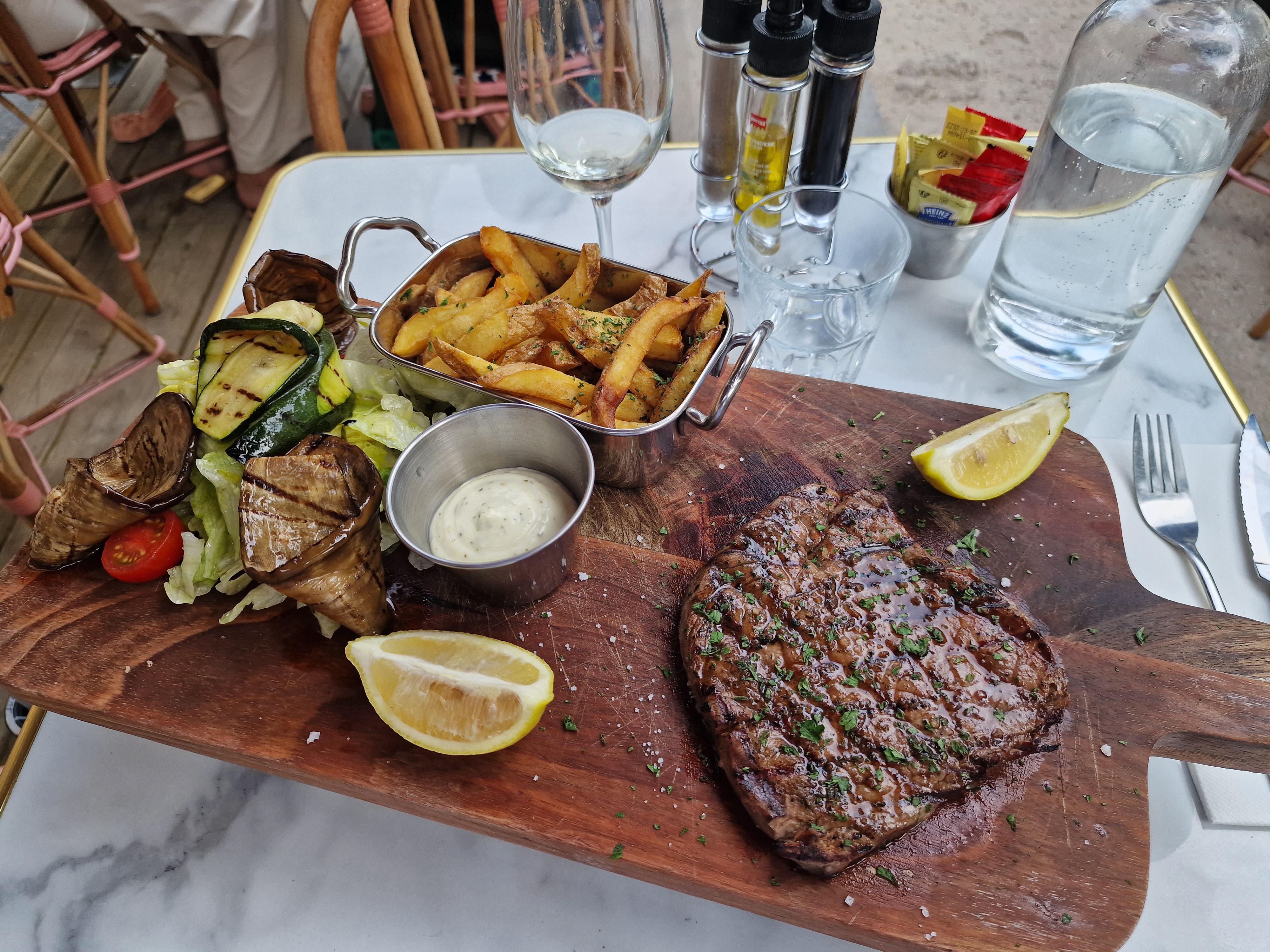 Nous avons commandé du steak. C'était super cher et de très mauvaise qualité. Nous l'avons payé 80 euros. Les frites étaient détrempées avec des TONNES D'HUILE et la salade était composée de trois feuilles de laitue et de tomates pour 7 euros.