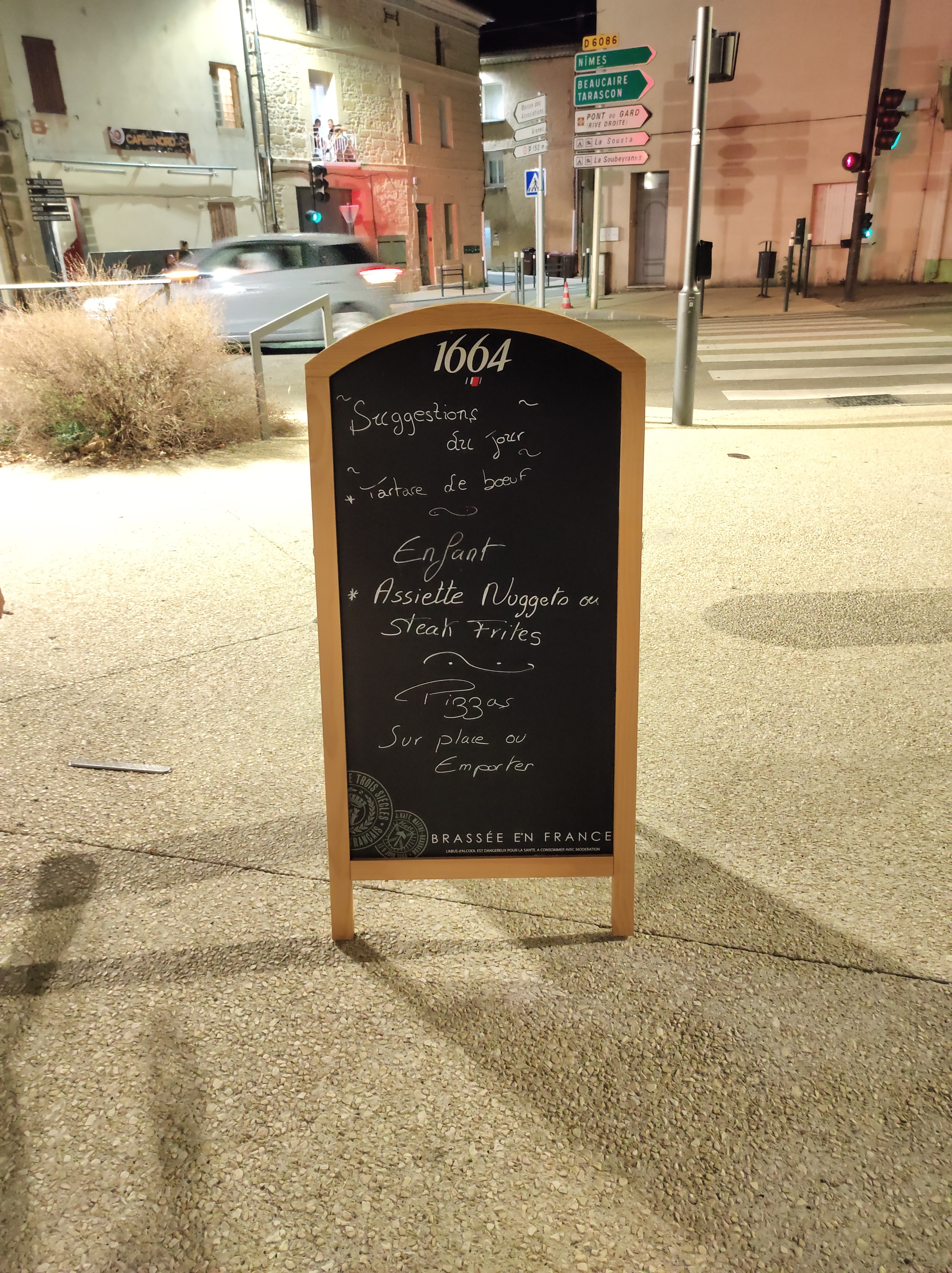 J'ai passé une belle soirée pour un premier vrai repas de vacances à La Brocante à Remoulins, et c'était fantastique. Le personnel était super sympa et serviable, patient aussi compte tenu de mon français approximatif, le service était de premier ordre et quant à la nourriture, elle était tellement copieuse que nous ne pouvions gérer que le plat principal. J'ai eu les Tentacules De Poulpe (tentacules de poulpe) avec des frites et de la salade, maman avait du Filet De Bar (bar), également avec des frites et de la salade, et étant donné que nous ne sommes pas les plus aventureux en matière de nourriture, c'était superbe.