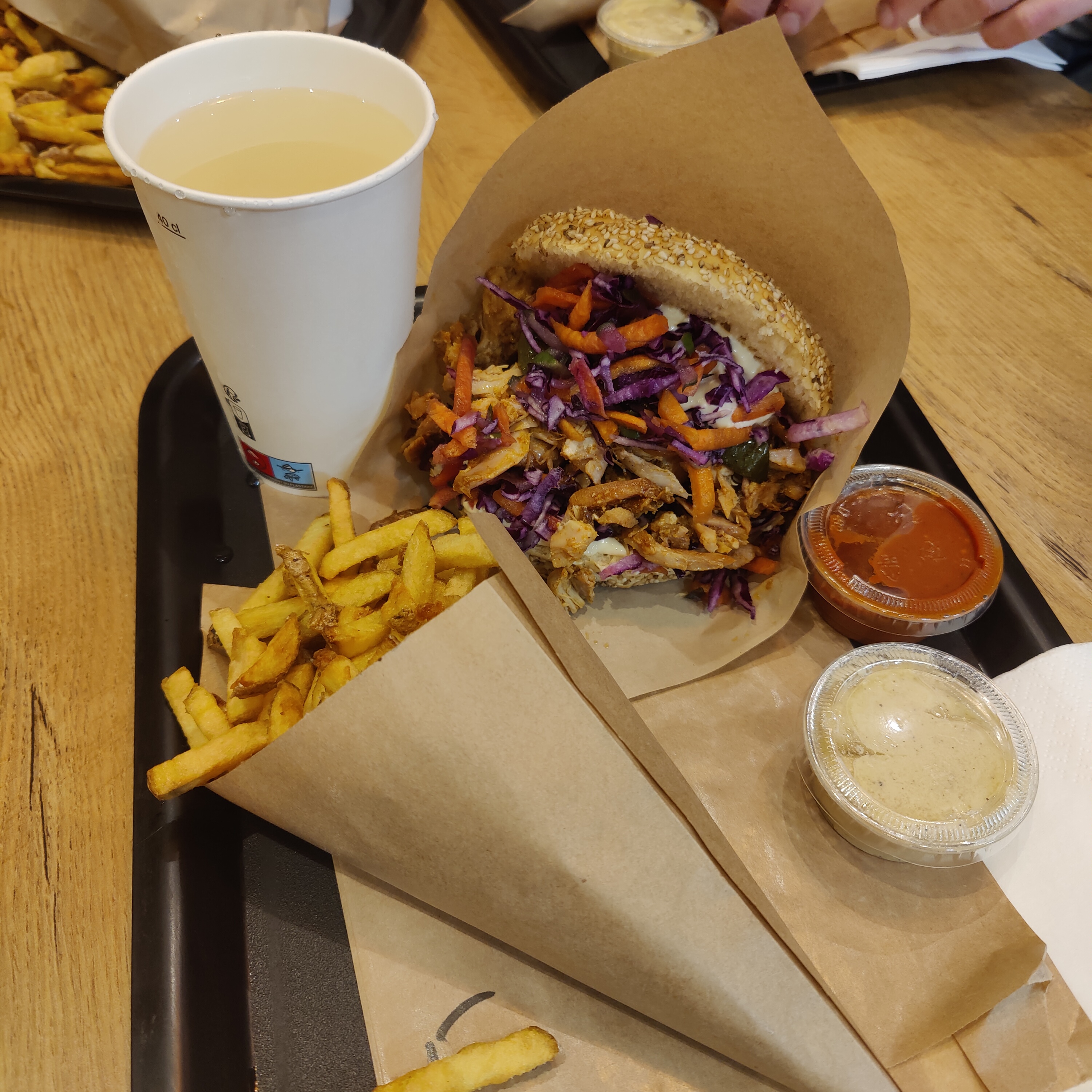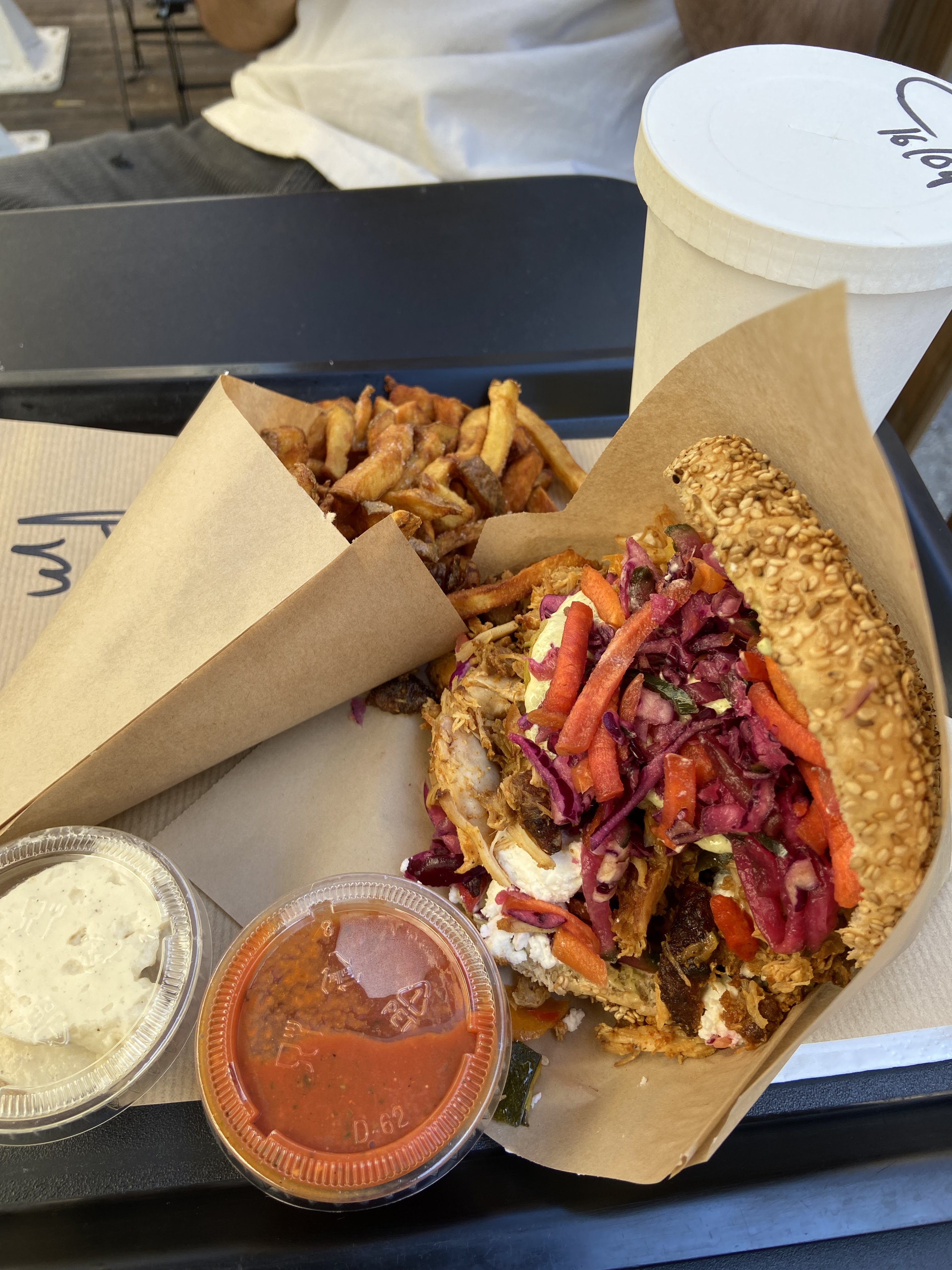 La nourriture est excellente, tout est juicy le pain est bon et pas sec du tout. Il y a des boisson faites maison ce qui est un plus! Le service est agréable mais il est dommage que ce bel endroit ne soit pas rempli après cela dit l’ambiance y est très calme et agréable pour discuter en terrasse :)