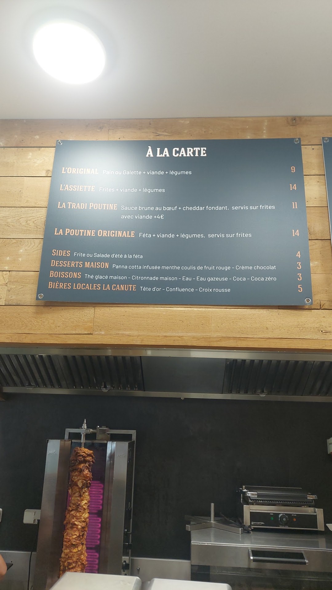 J’ai pris l’assiette Poutine, pour 13 euros, très léger, frites trop cuite et trop petite ( on dirais les fond de friteuses ) le poulet bon, la sauce aussi, pas de pain avec la poutine ( on m’a envoyer au libanais pour en avoir ) avis mitigée. Mon ami a pris une broche, pain trop cuit et même pas 100 gramme de frites pour 3€ ( la petite ) La mayonnaise étais bonne Un petit sourire aurais été le bienvenue Honnêtement déçu.