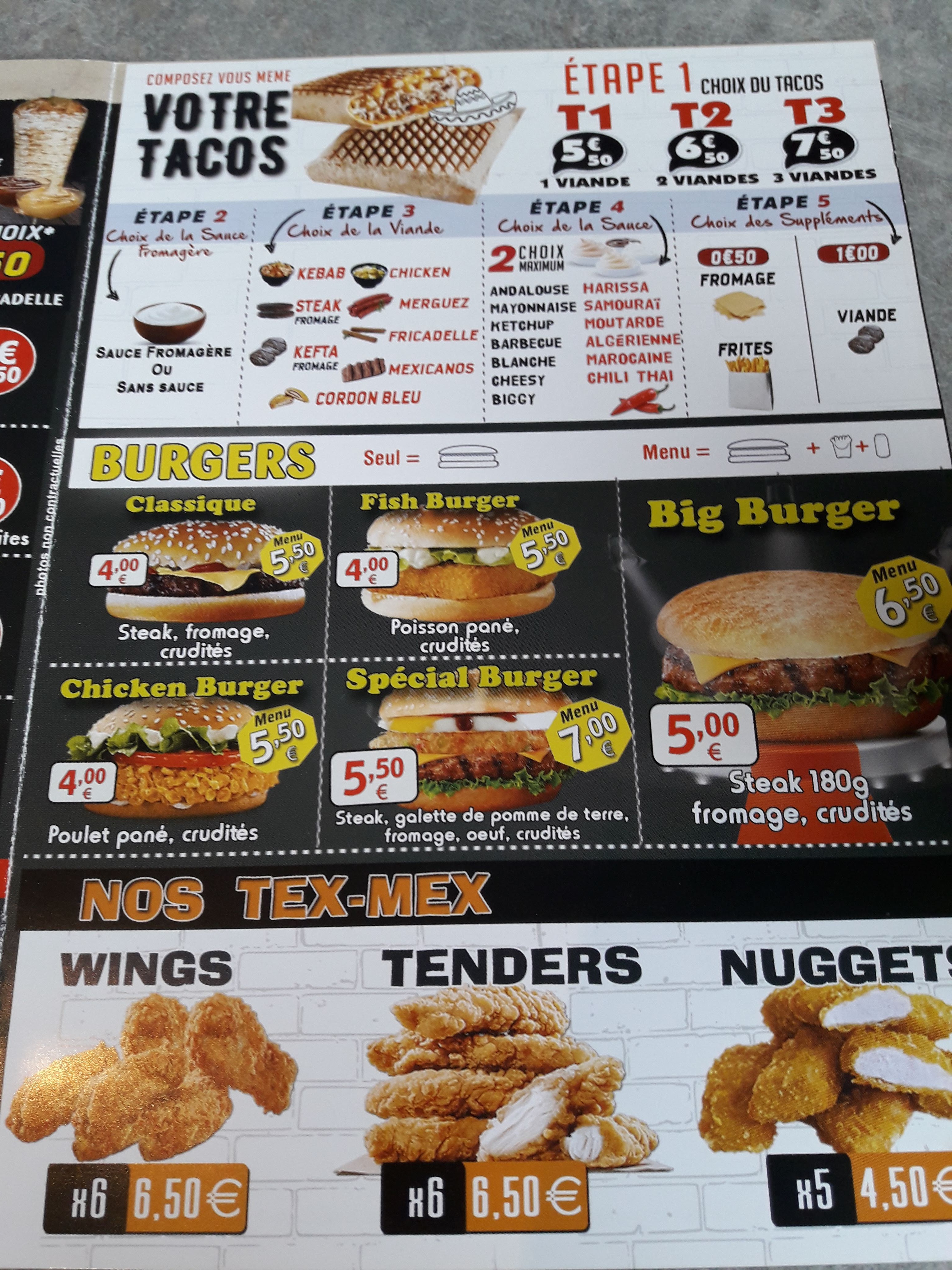 Je suis passé ce soir et j'ai pris un tacos 3 viandes ! Franchement l'accueil super bien, plat à emporter super rapide (5min) malgré qu'il y est des clients ! Et je me suis bien régalé, le tacos bien costaud ! J'ai calé 😂 Je repasserai sans hésiter pour tester d'autres plats ! Je ne pourrais que conseiller Bonne continuation à vous ! Bien cordialement