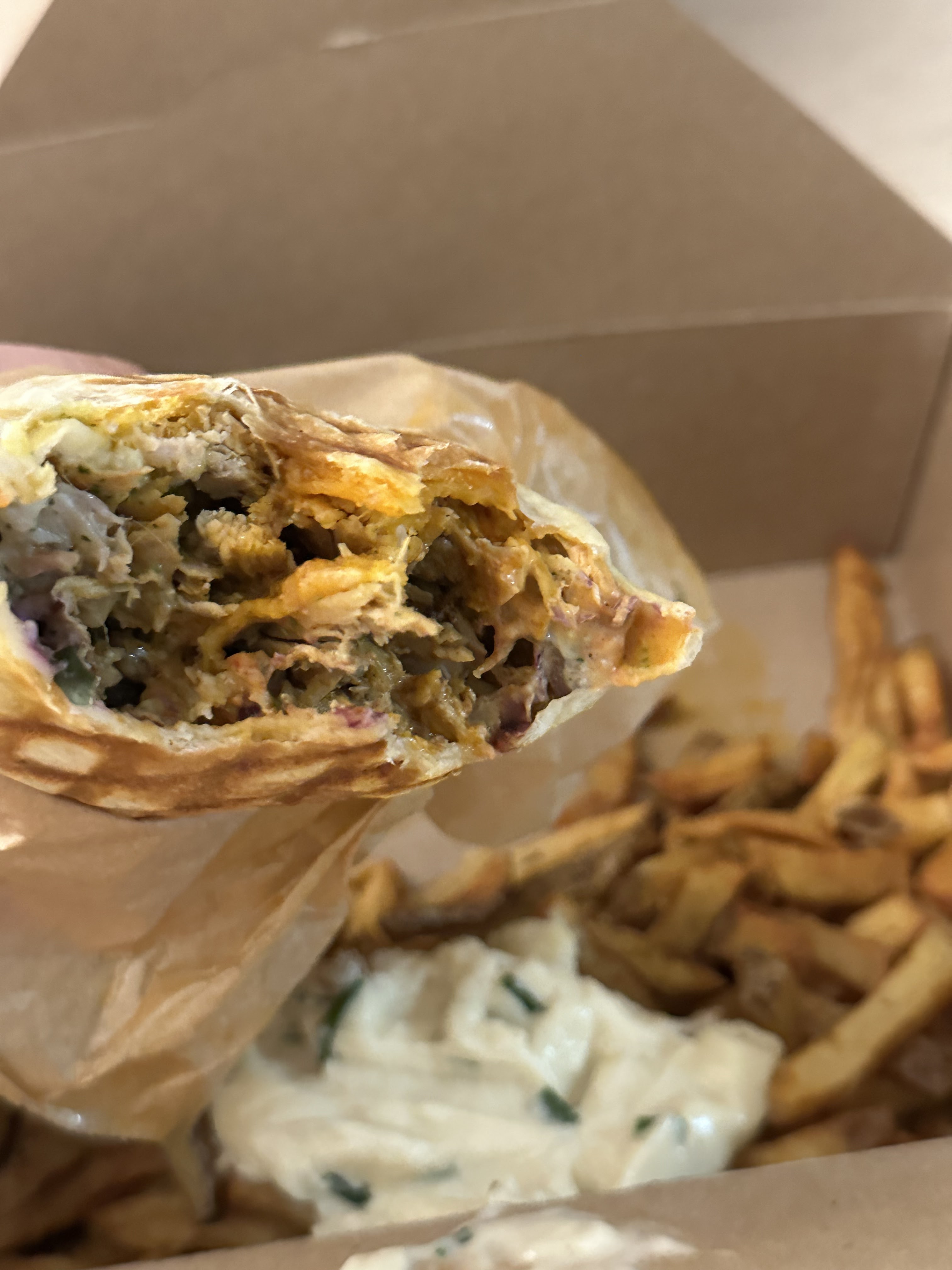 Galette Kebab incroyable ptn rien à voir avec ce qu’on connaît d’habitude. Écoutez moi bien prenez : -menu galette viande avec ces sauces : treille ; la dogue (pimenté) ; -pour les frites (fait maison incroyable aussi) : mayonnaise maison. c’est vrm une dinguerie comment c’est bon, je recommande. Si vous voulez prendre à emporter, pensez à prendre des serviettes ou aller dans un lieu avec possibilité de se laver les mains