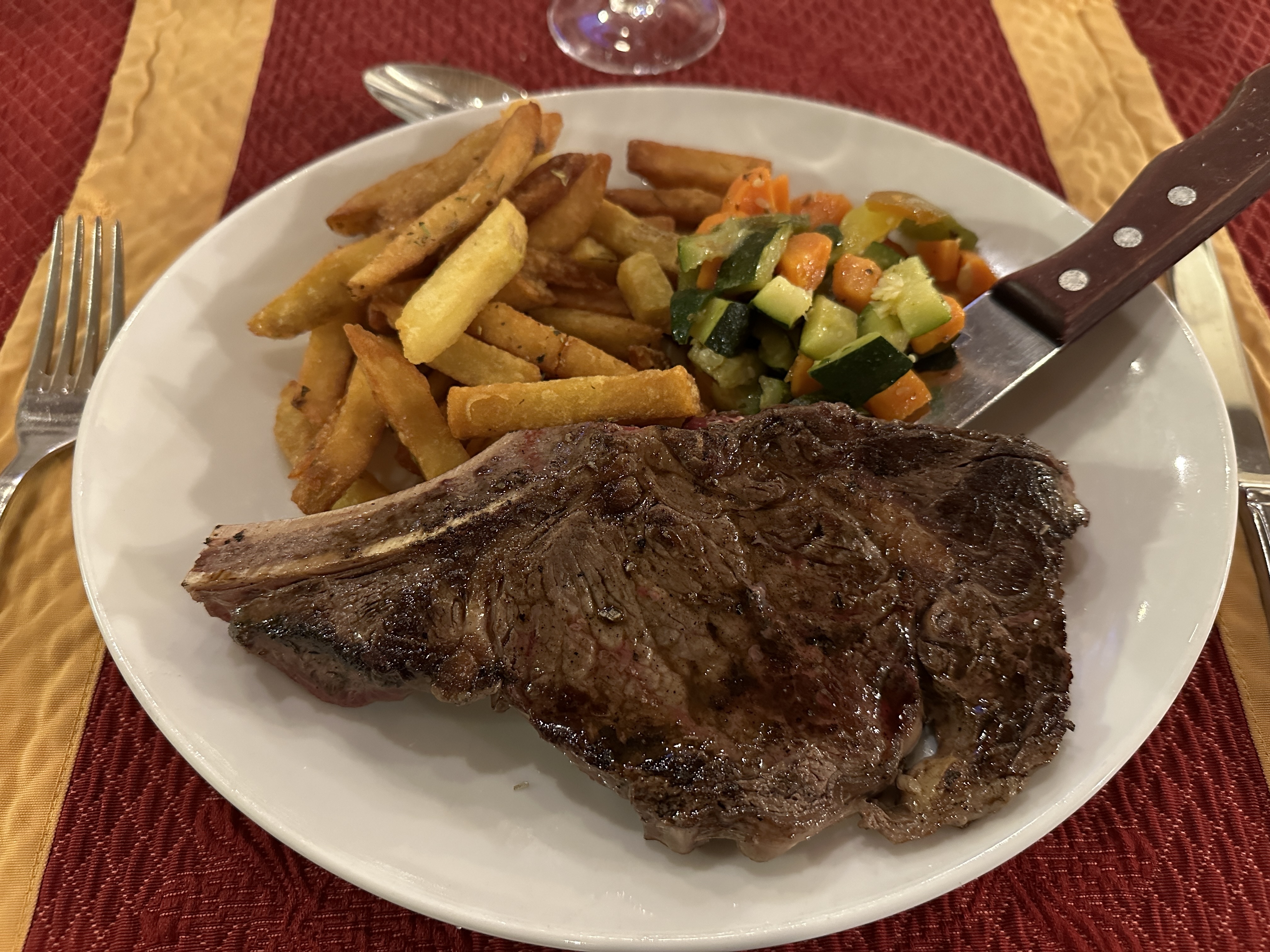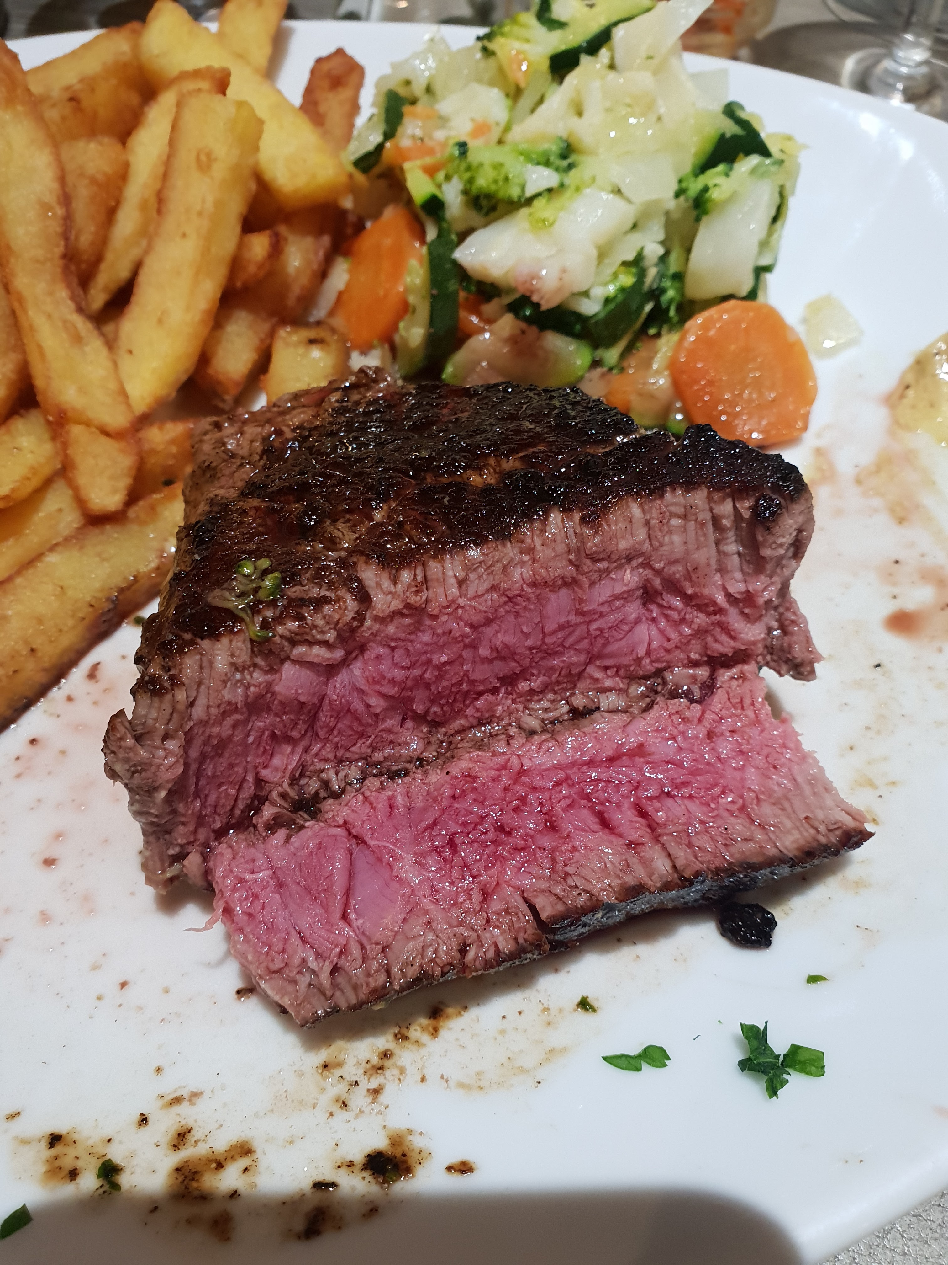Service impeccable, viande très bonne quoi que manque un peu de cuisson. Par contre, autant je trouve très louable de servir des légumes avec les frites, autant mettre une poêlé de légume surgelé...ça casse clairement le côté chic du restaurant.
