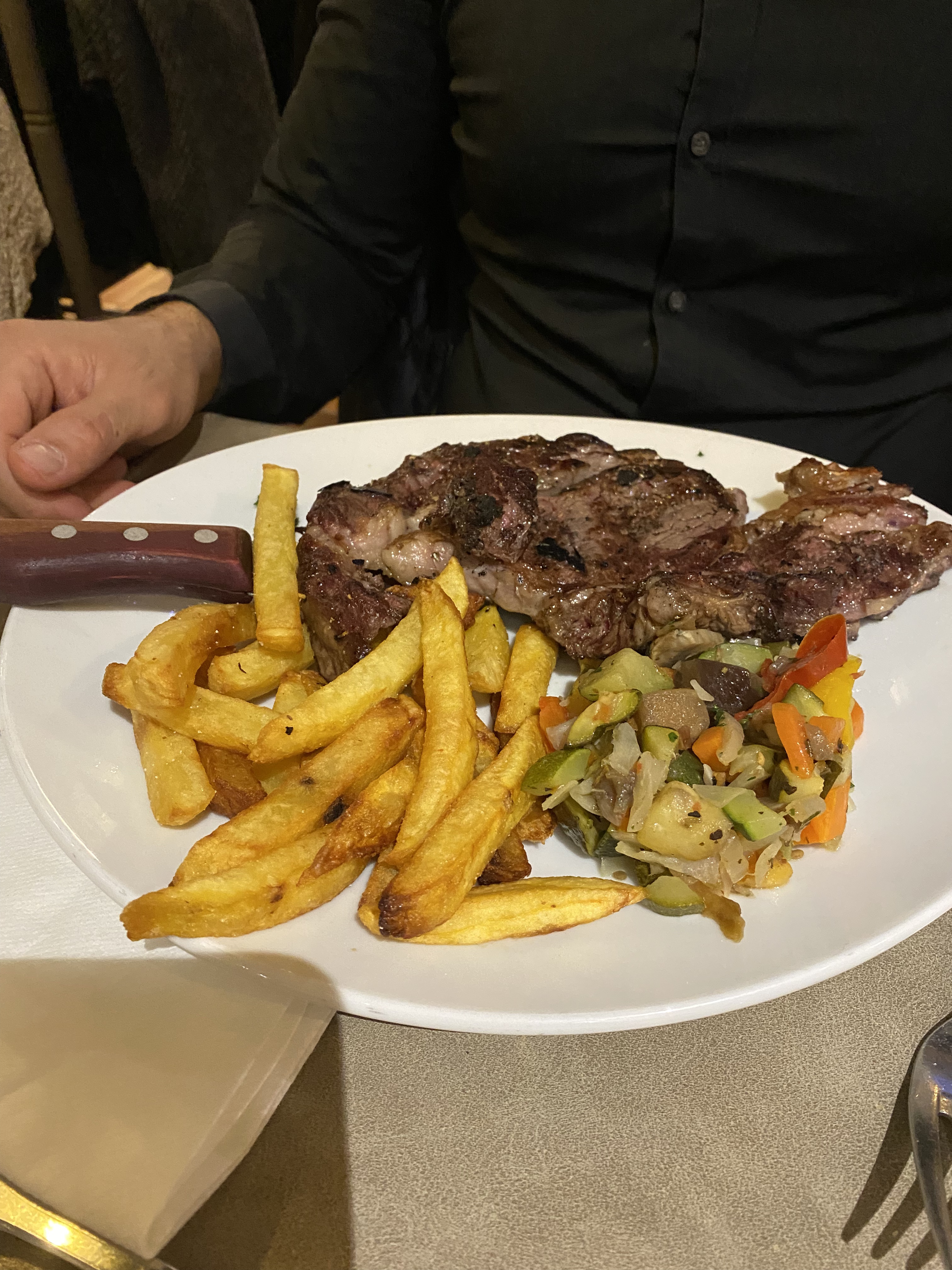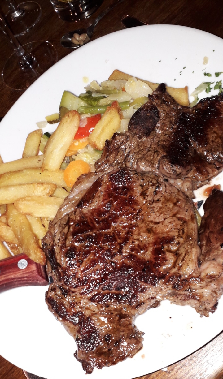 Bel établissement et bel accueil. C'est le patron qui est aux commandes du feu de bois. J'ai pris une noix d'entrecôte Black Angus cuisson bleue. Autant le dire tout de suite, ce morceau de viande bien persillé m'a enchanté. Un produit non seulement de très grande qualité mais aussi un chef qui maîtrise parfaitement les subtilités de la cuisson. Du grand art. Je n'ai rien pris d'autre ni entrée ni dessert. En fait j'ai repris une deuxième entrecôte c'était trop bon.. Un goût mais un goût !! La viande est accompagnée de légumes et de frites maison bien croustillantes mais parfois un peu trop cuite selon la fournée. Bref, un grand moment de plaisir gustatif tout en simplicité et convivialité. Je recommande chaudement.