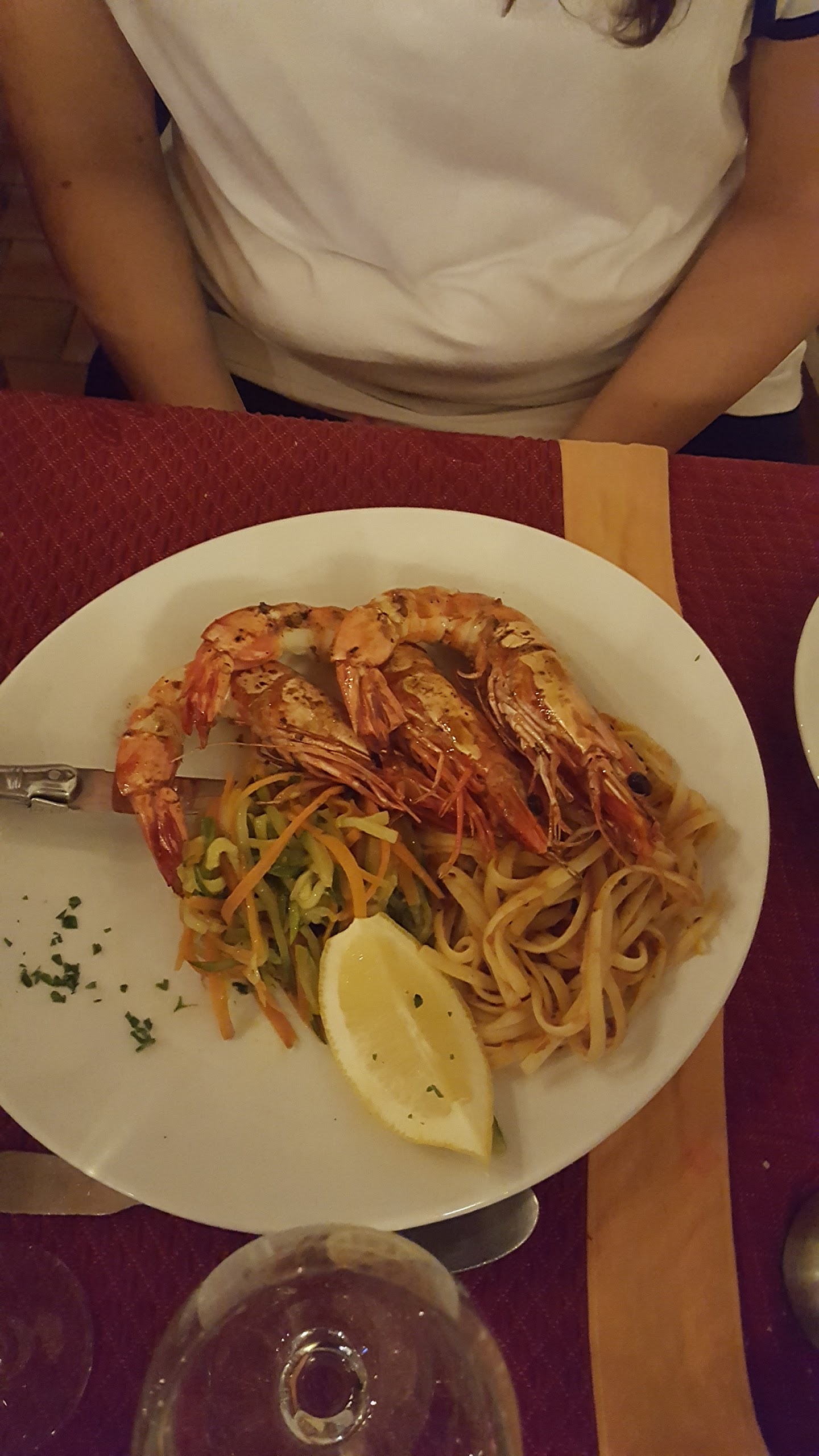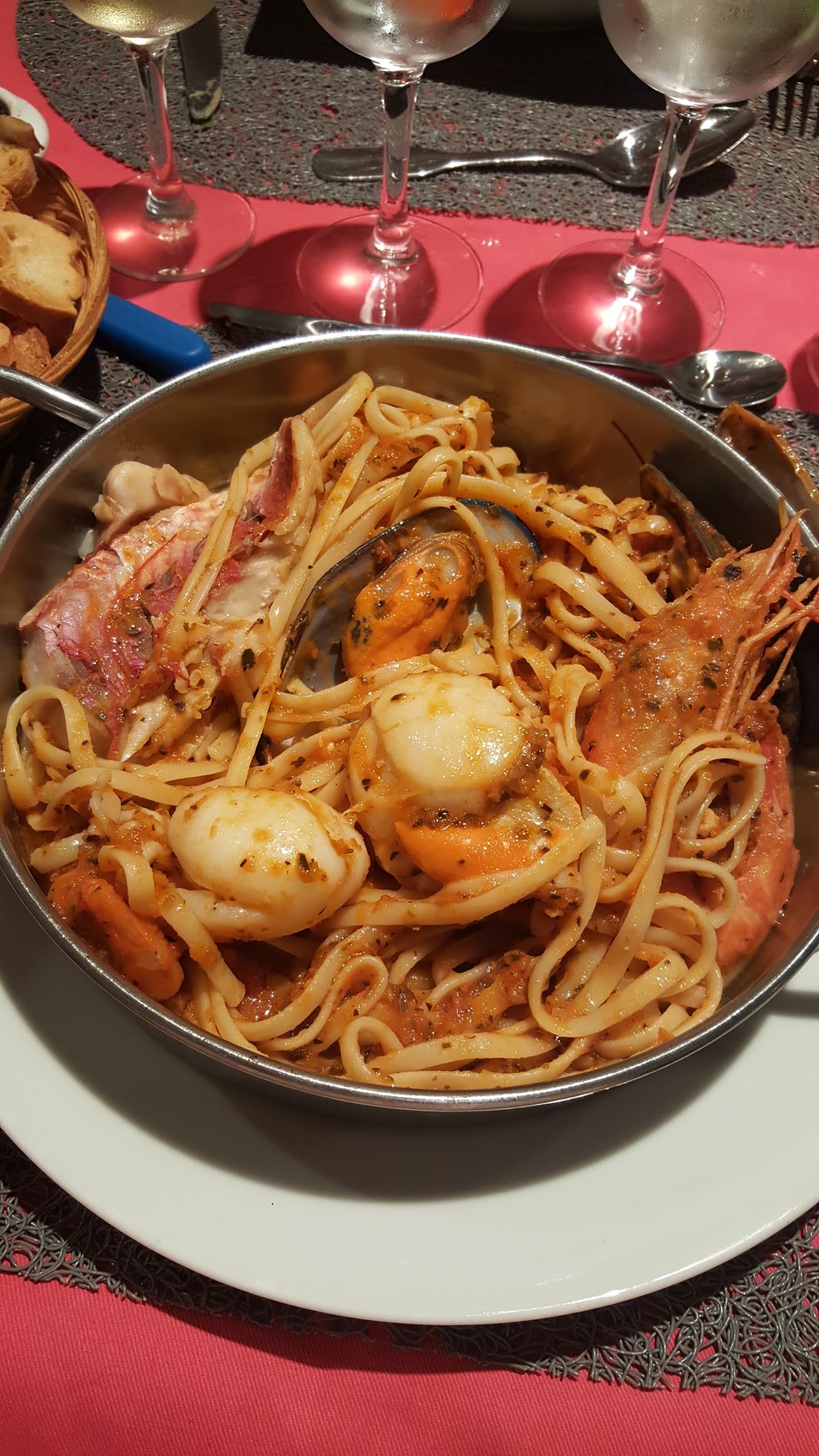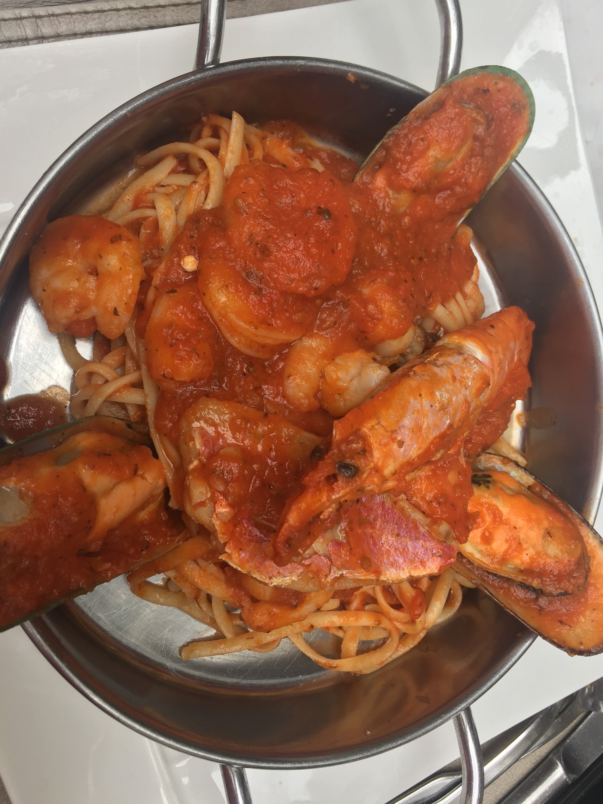 La poêle du pêcheur était tiède. Cela signifie, que de nombreux plats sont simplement réchauffés et non fraîchement préparés. Les pâtes dans la poêle étaient trop cuites. De plus, la poêle ne contenait pas tout ce qui était promis au menu. Lorsque nous avons fait remarquer cela à la serveuse, elle a simplement dit ironiquement : « Oh my god ». Un restaurant dans cette gamme de prix qui vend des plats du midi le soir est un « no go » !