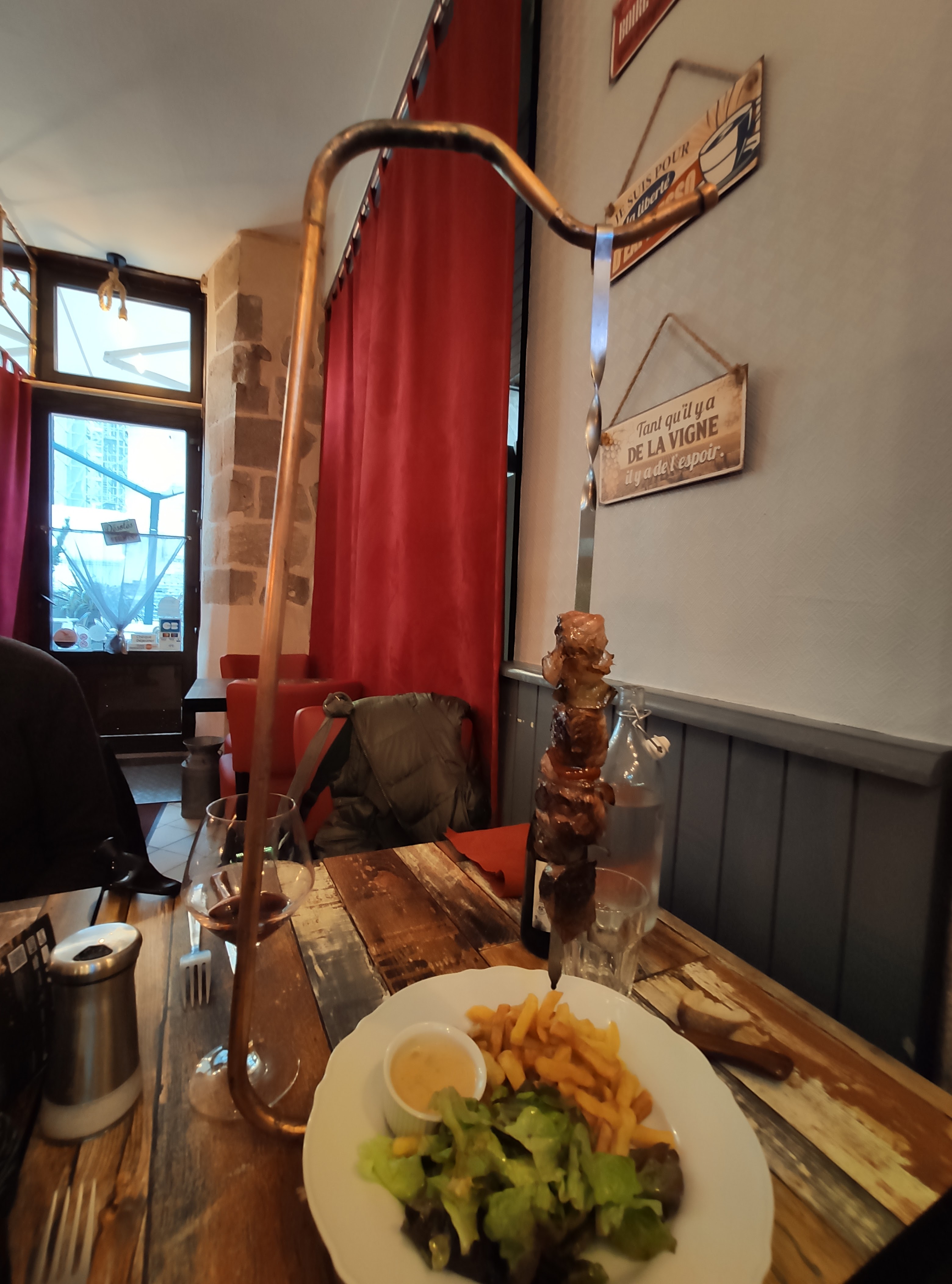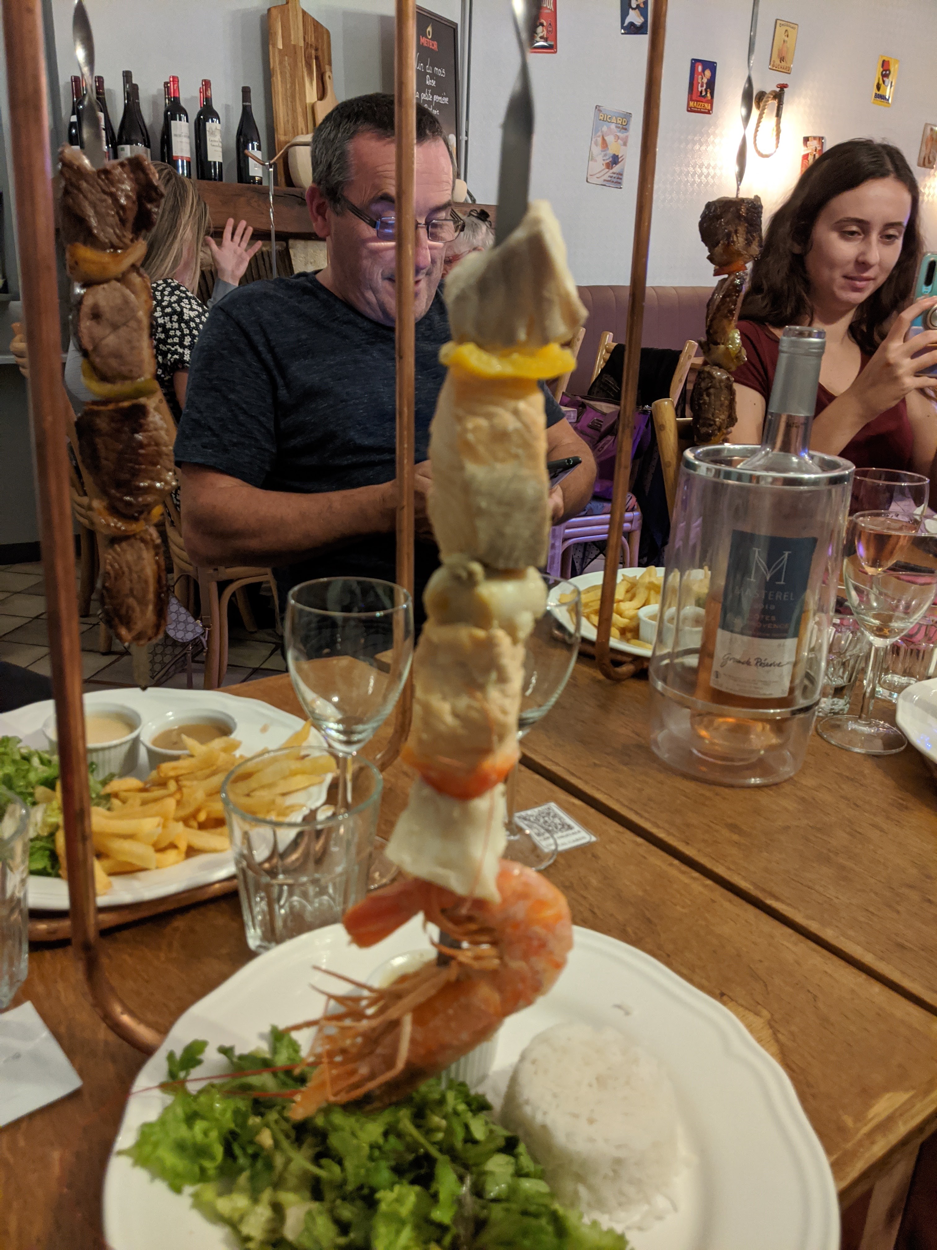 Supers resto avec les brochettes servie à la verticale de poisson ou bœuf canard ou volaille et bien d autre plat délicieux ex l l'andouillette mmmmm