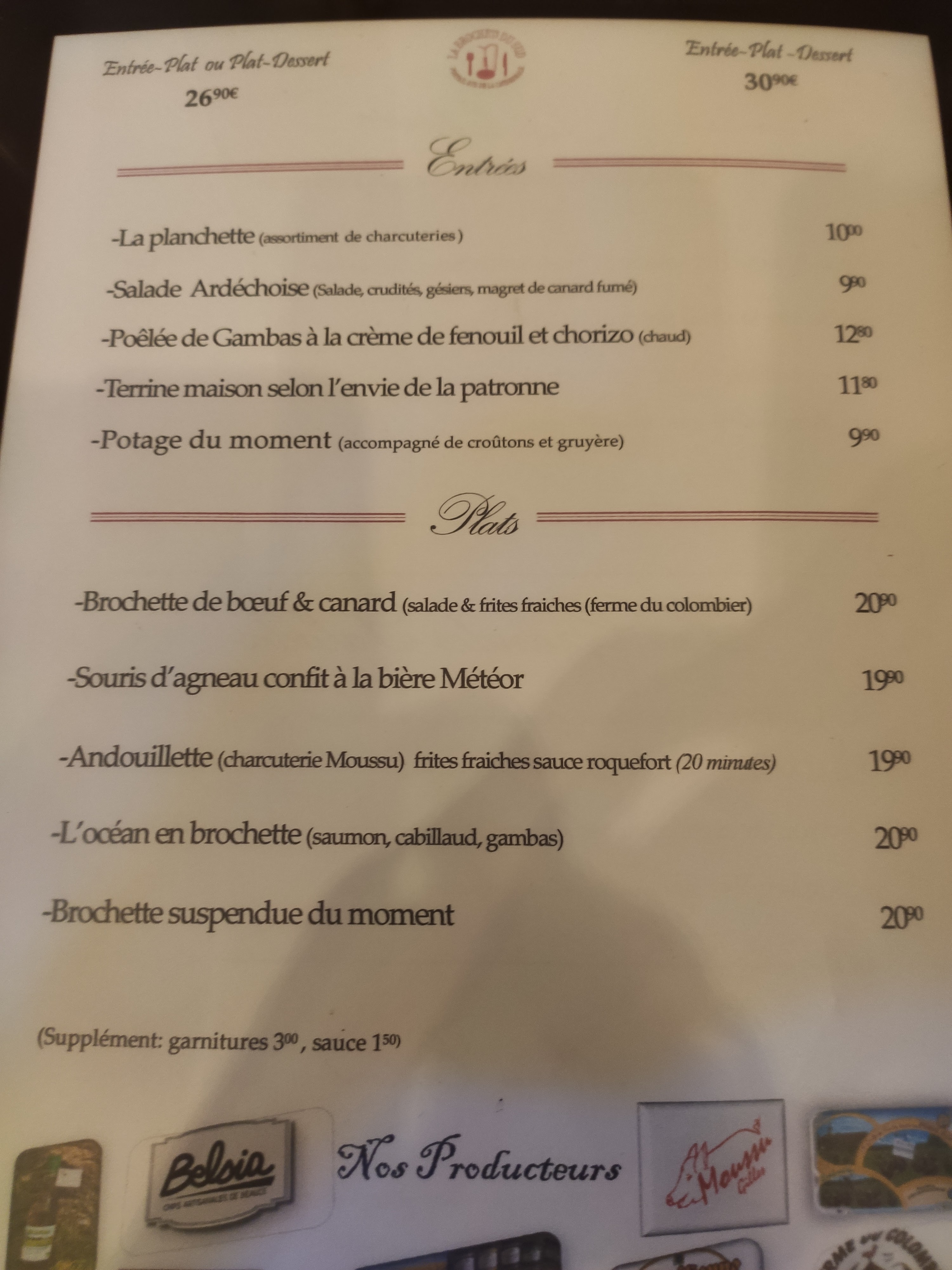 Une première fois pour nous dans ce restaurant. Dîner à deux, brochette et andouillette avec en entrée la terrine maison. Tout était excellent! Avec en prime une amabilité du personnel qui est très agréable. Le prix reste cependant un peu élevé à mon goût. Mais le menu a 30 euros vaut le coup. Bref vous pouvez y aller les yeux fermés.