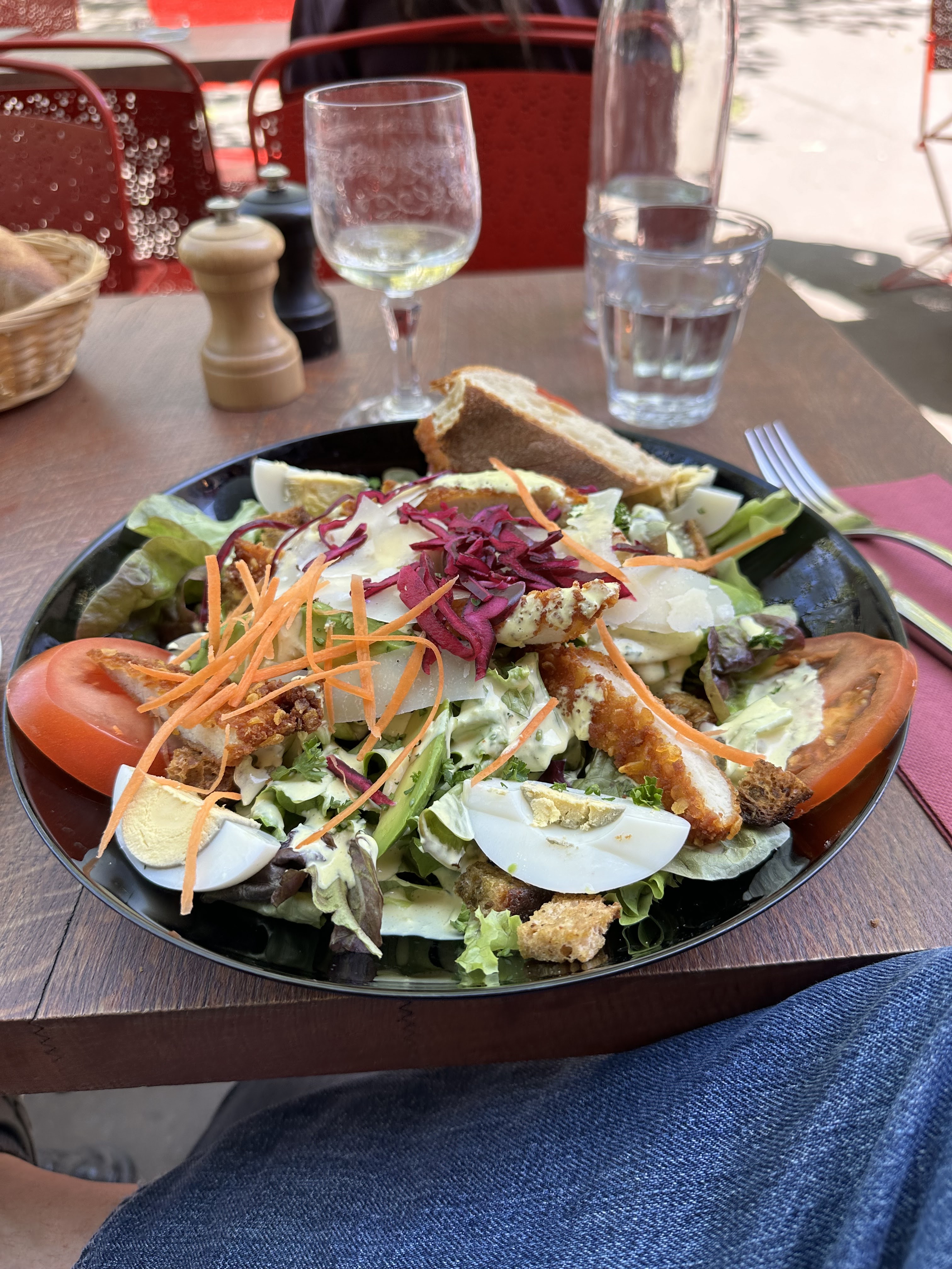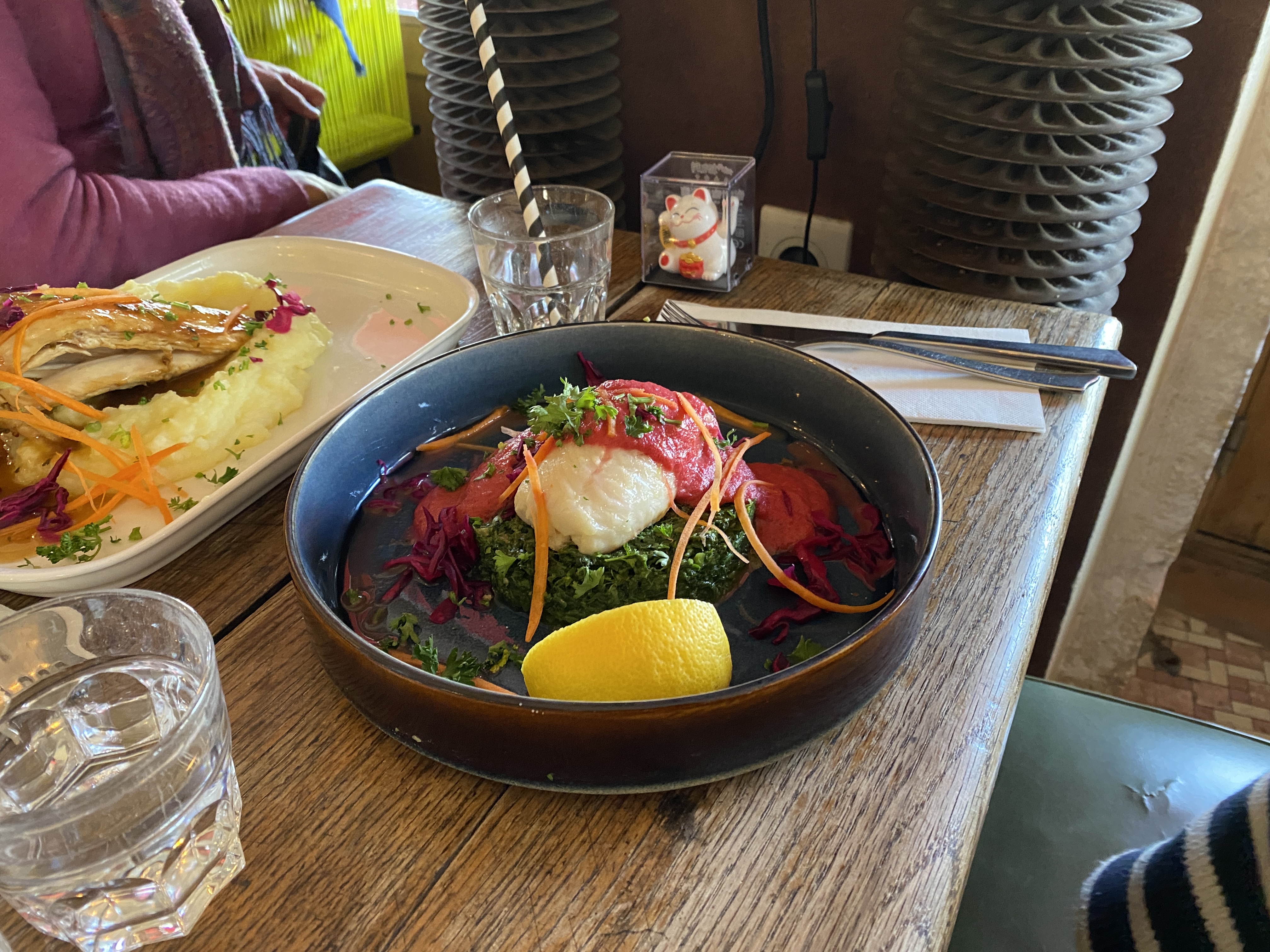 ils sont chaleureux et conviviaux, et vous pouvez vous dégourdir les jambes car c'est spacieux. J'ai eu le saumon dans une sorte de sauce mousseuse qui était plutôt bonne mais la star était le dessert ! ça s'appelle la pomme de pain. ce n'est qu'à 15 minutes en train de l'arrêt du Louvre mais le quartier est tellement détendu et différent et la vue est belle. ça vaut vraiment le coup. ma facture totale était d'environ 52 euros pour un repas de 3 plats et un verre de vin blanc.
