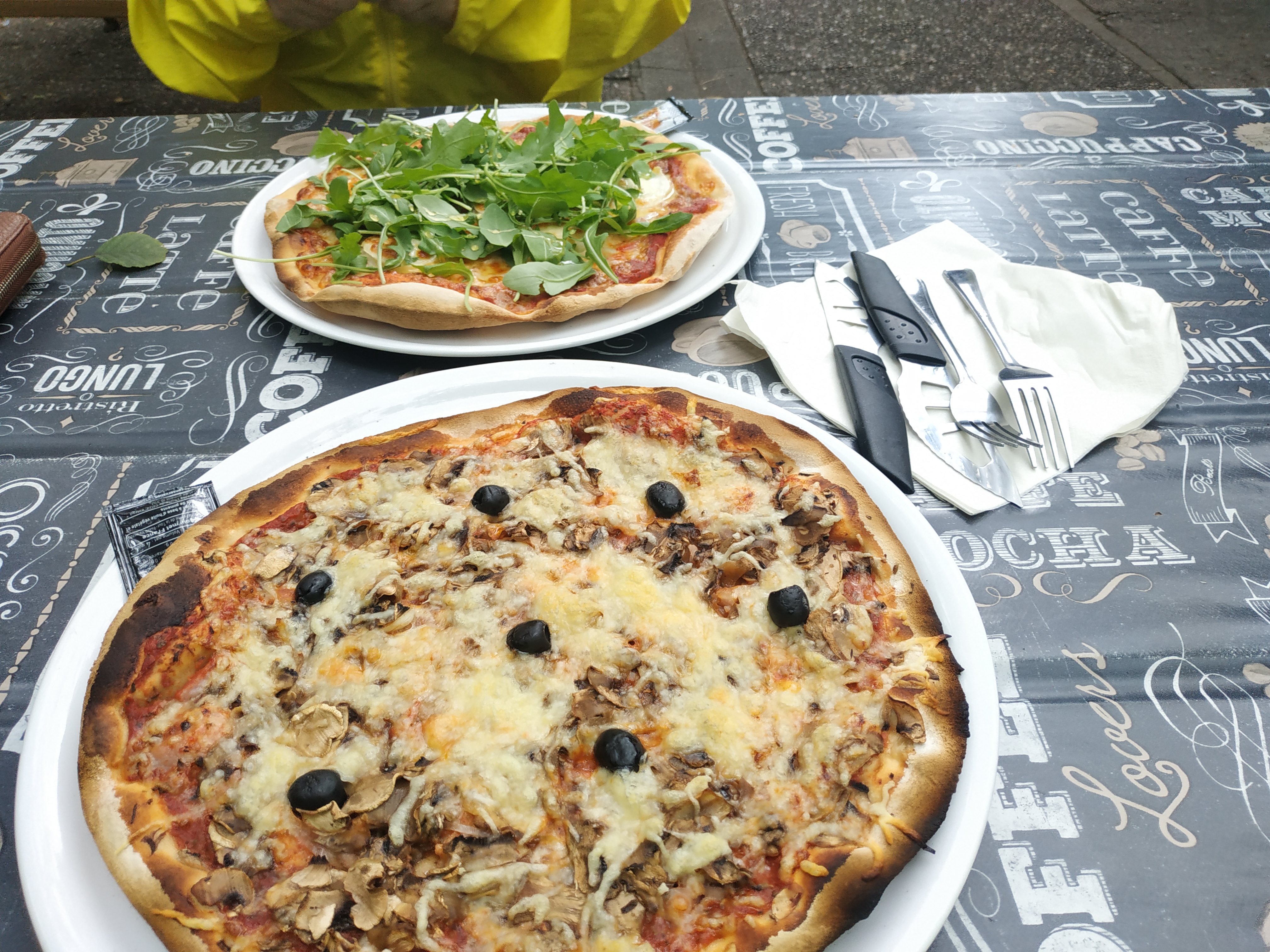 Bon service, bonne, grande salade, la pizza a bon goût, mais la base est définitivement trop sèche ou dure. Dommage