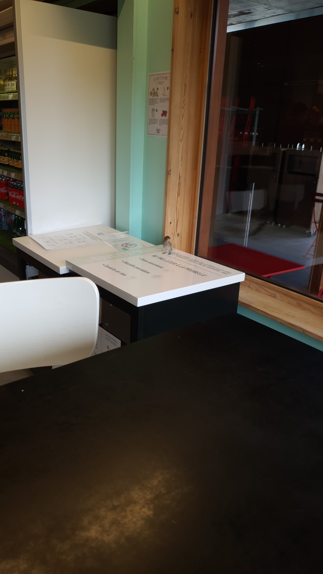 Des moineaux et pigeons dans la cafet un peu partout et sur les tables car la porte donnant sur la terrasse extérieure reste ouverte, oui même l'hiver. Les moineaux viennent vous voir sans cesse très près quand vous mangez, et picorent les croissants sur le comptoir, qui seront vendus bien sur. Tout semble normal pour le personnel. Hygiène 0 !