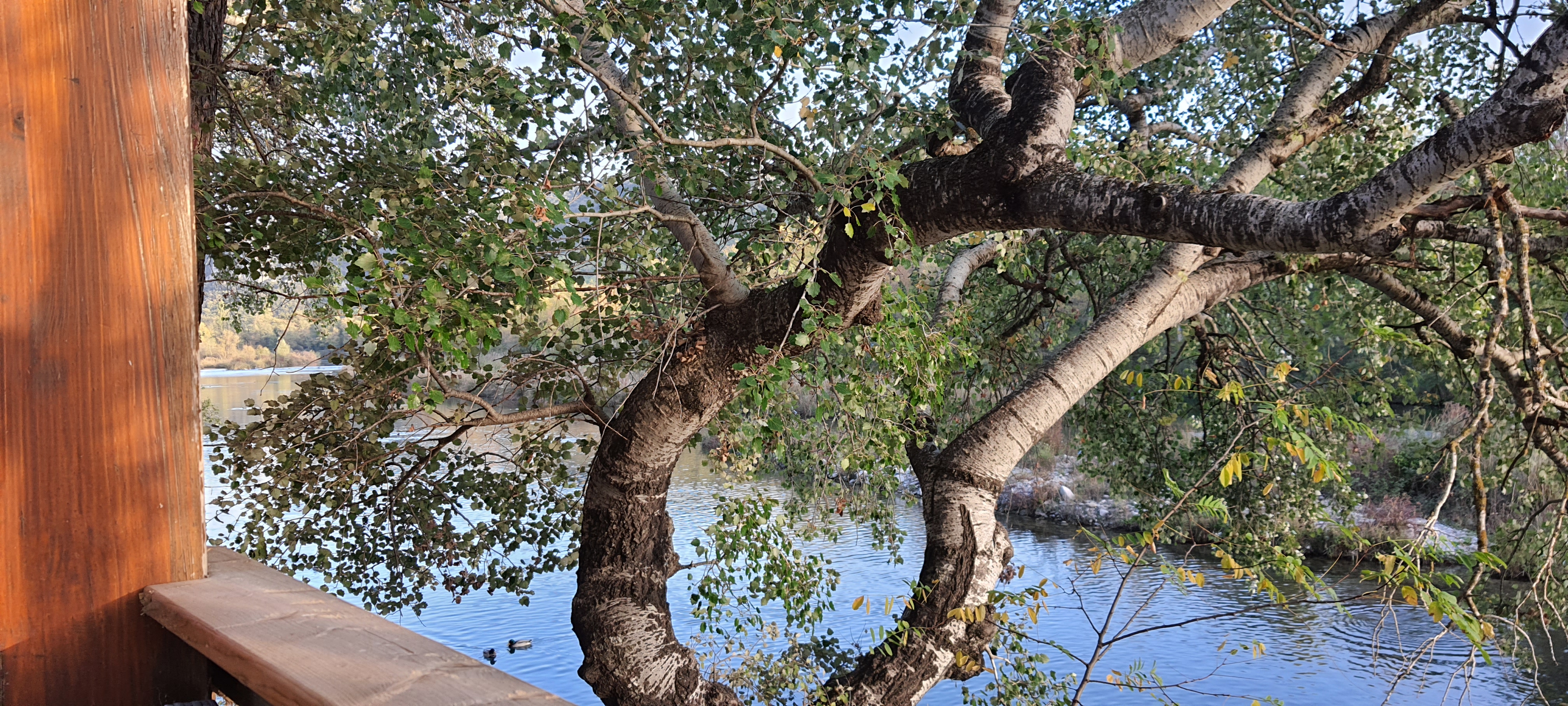 Très agréable le long du verdon entre canards, et oiseaux qui mangent les miettes sous la tonnelle avec le vent qui nous caresse le visage. La nourriture excellente et copieuse Le personnel très avenant souriante et aimable.