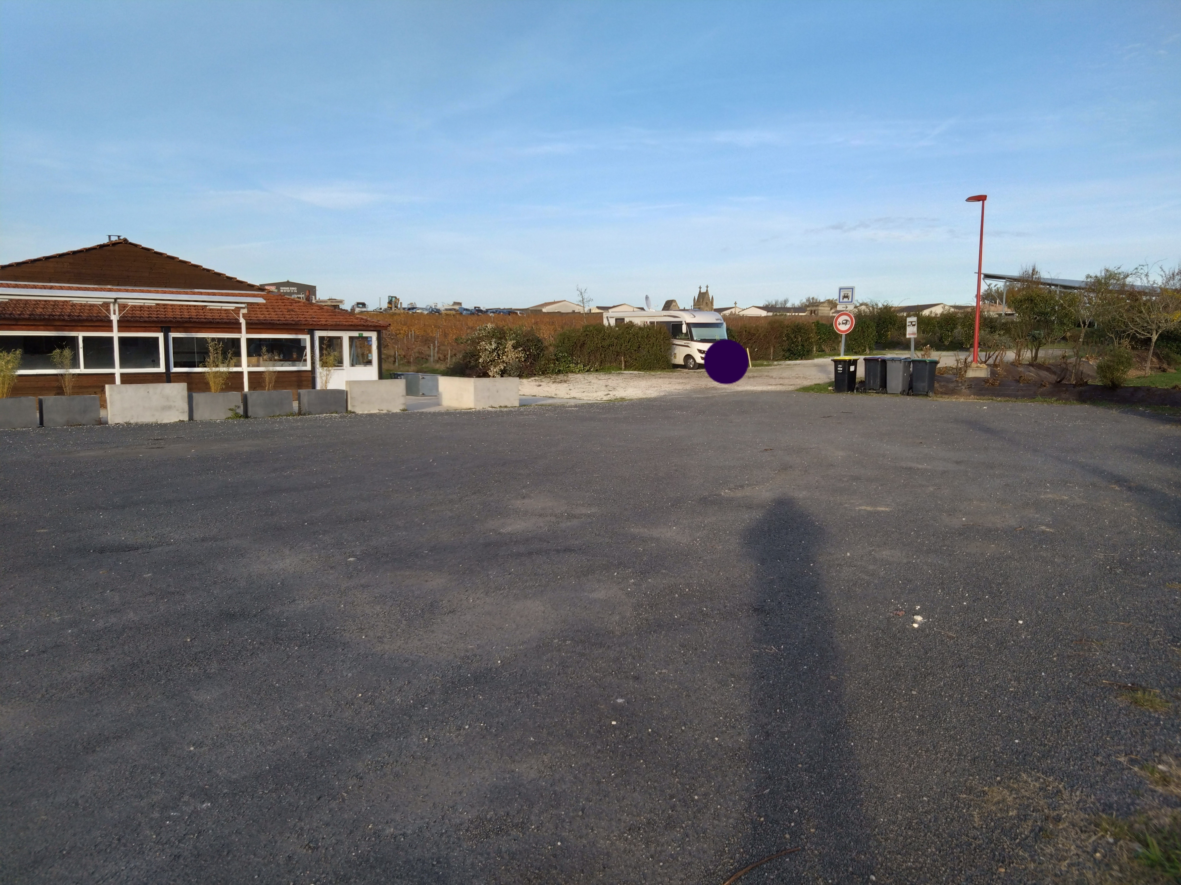 Aire un peu bruyante en journée mais nettement plus calme le soir, pas très propre mais qui a le mérite d'exister et surtout d'être gratuite non loin de Bordeaux. 6 emplacements en graviers stabilisés bien séparés par des haies, électricité payante, poubelles, borne de vidange HS. Un petit parc de jeux pour enfants d'un côté, une route et des vignes de l'autre. Le petit snack en bas de l'aire semble fermé, dommage.